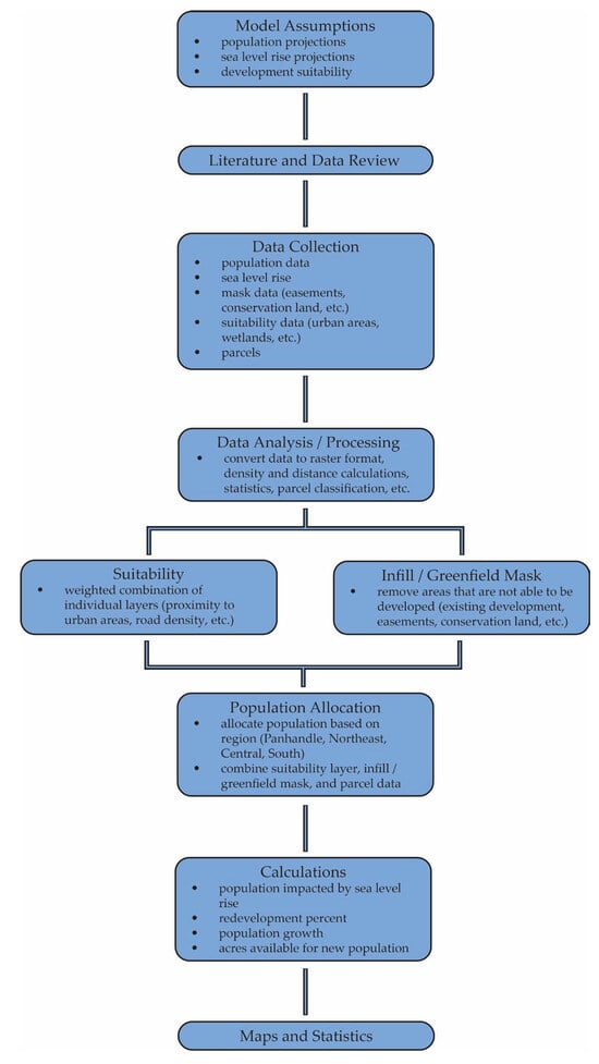 This study used a GIS-based model to produce future development scenarios for the state of Florida that incorporate population growth projections, assumptions about development patterns, and future sea level rise for a 2040 and 2070 time horizon. The study utilized publicly available data from a variety of state and academic sources. In some cases, older population projections or other data were used in the 2070 models to maintain consistency with the 2016 Florida 2070 study [10]. The 2040 models used the most currently available data to better facilitate analyses using the shorter timeframe.