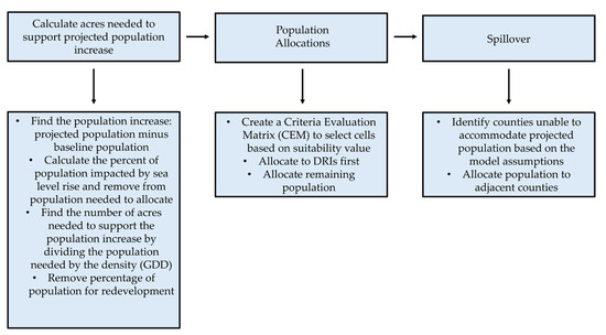 The LUCIS methodology uses GISs to analyze the suitability of land for various uses and identify conflict between competing land uses [10]. The methodology was further developed into LUCIS plus which added more detailed allocations including employment for uses such as commercial, retail, service, industrial, and institutional [11]. The LUCIS methodology is adaptable to a wide range of scales and needs, and not all aspects of the methodology are implemented on every project. More detailed analyses such as suitability layers for non-residential uses, employment allocations, and conflict identification sometimes used at county-level scales are also discussed as part of the LUCIS model but were not included in Sea Level 2040/2070 models.