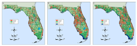 This study relied on several data sources to identify existing and potential conservation lands (Figure 2). The Florida Managed Areas database (FLMA) developed by the Florida Natural Areas Inventory [25], includes boundary and statistical information provided directly by the managing agencies for federal, state, local, and privately managed lands. These are existing already protected lands conserved by fee simple, easement, or other conservation mechanisms. Florida Forever is one of the state’s two primary land acquisition programs, focused on acquisition of lands for conservation and nature-based recreation. Approximately 3.8 million acres of unprotected Florida Forever project lands were used in this project as one of two datasets to identify conservation priorities [26]. The Florida Wildlife Corridor (FWC) (Priorities 1–3 of the Florida Ecological Greenways Network (FEGN)) [27], consists of a network of ecologically significant, functionally connected public and private lands with approximately 7.7 million acres of unprotected lands, which were used as a second dataset for identifying high conservation priorities. This network plays a crucial role in guiding federal and regional land acquisition efforts by providing information on priorities for maintaining critical, intact landscapes and ecological corridors [28]. While the FWC and Florida Forever projects were permitted to develop in the Sprawl Scenario, they were excluded from the Conservation Scenario as a means of evaluating whether future development might be accommodated while avoiding impacts to high priority conservation areas.