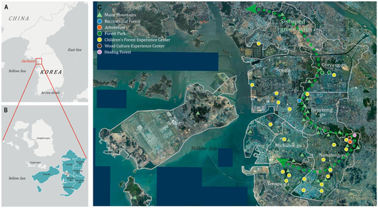 Study site: (A) Regional map indicating the location of Incheon Metropolitan City (red square). (B) Administrative map showing the districts within Incheon Metropolitan City. (C) Satellite map of Incheon Metropolitan City, highlighting the locations of forest recreation facilities and major mountains. The green arrow indicates the urban forest axis.