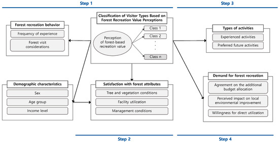 The survey data were analyzed using R 3.6.1 with the polytomous variable LCA (poLCA) package and BM® SPSS® Statistics Version 29.0 (IBM Corp., Armonk, NY, USA). Figure 2 outlines the analytical process and statistical methods employed to explore the visitor types and their characteristics.