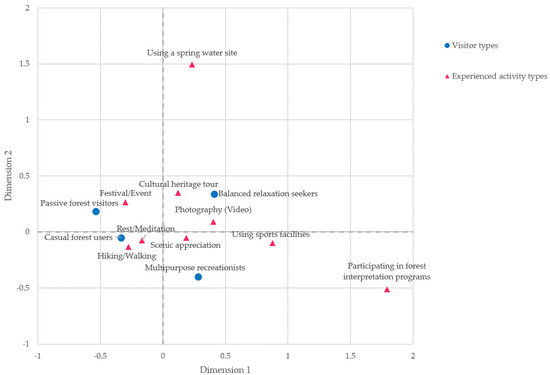 Perceptual map of the relationships between visitor types and experienced activity types.