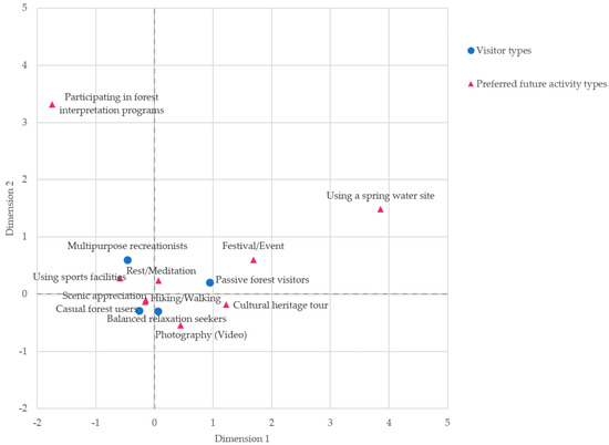 To explore the relationship between visitor types and forest-based activities, CA was conducted using data on both past-year activity experiences and future activity preferences. The perceptual maps illustrate the associations among visitor types and activity patterns, offering insights into user behavior and strategic implications for forest recreation service design.