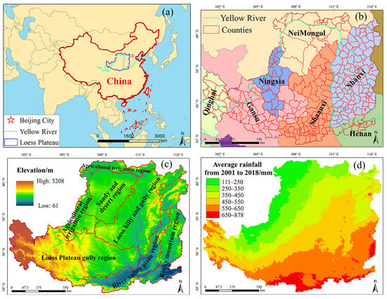 The LP is located in northern China (Figure 1a), with a geographical coverage of 33°20′ N–41°43′ N and 100°41′ E–114°38′ E. It is the largest loess accumulation area in the world, encompassing 334 counties across seven provinces: Shanxi, Inner Mongolia, Henan, Shaanxi, Gansu, Ningxia, and Qinghai (Figure 1b). The land area is approximately 62.5 × 104 km2, accounting for about 6.51% of China’s terrestrial area. The topography of the LP is complex. The northwestern part mainly consists of Agricultural irrigation region, sandy, and desert regions. The central part is dominated by loess hilly and gully region. The southwestern part features Loess Plateau gully region. The southeastern part primarily comprises River valley plain region, and the eastern part is mainly Rocky mountain region (Figure 1c). The terrain generally slopes from high in the northwest to low in the southeast, with elevation ranging from 61 m to 5208 m (Figure 1c). The climate of the LP is predominantly arid and semi-arid continental monsoon, with an average annual precipitation ranging from approximately 111 mm to 878 mm, decreasing from southeast to northwest (Figure 1d).