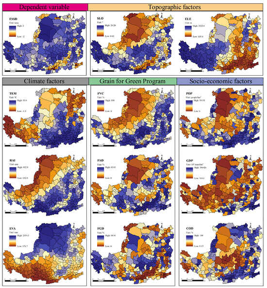 Spatial distribution of the selected drivers on the LP (SLO: average slope; ELE: average elevation; TEM: annual average temperature; RAI: annual average rainfall; EVA: annual average evapotranspiration; FVC: foliage vegetation cover; FAD: proportion of farmland; FGD: proportion of forestland and grassland; POP: population density; GDP: GDP density; COD: proportion of construction land).