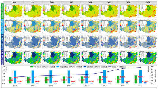 Spatiotemporal maps showing the ESs demand of provision services, regulating services, cultural services, and total ESs in the LP from 1990 to 2023.