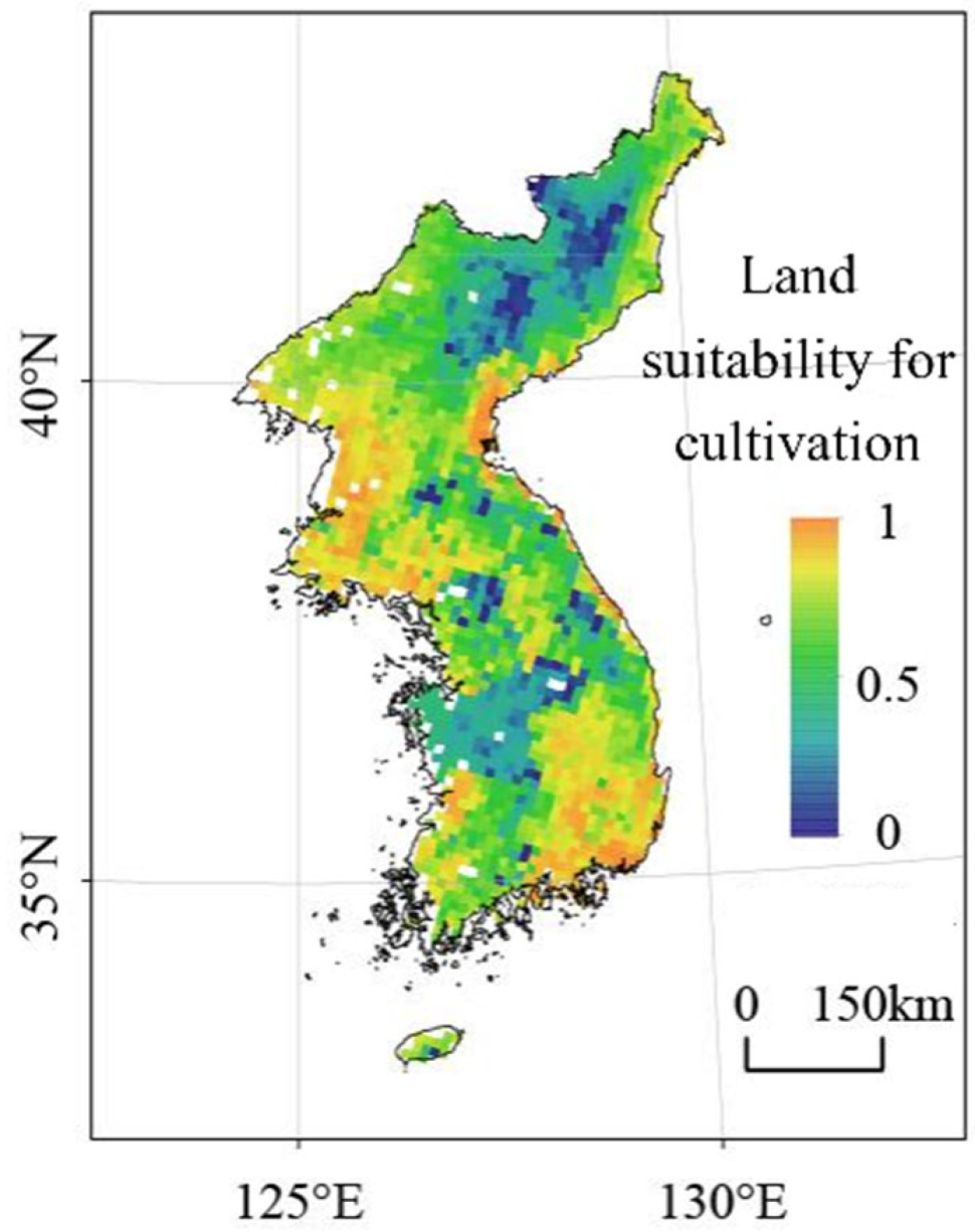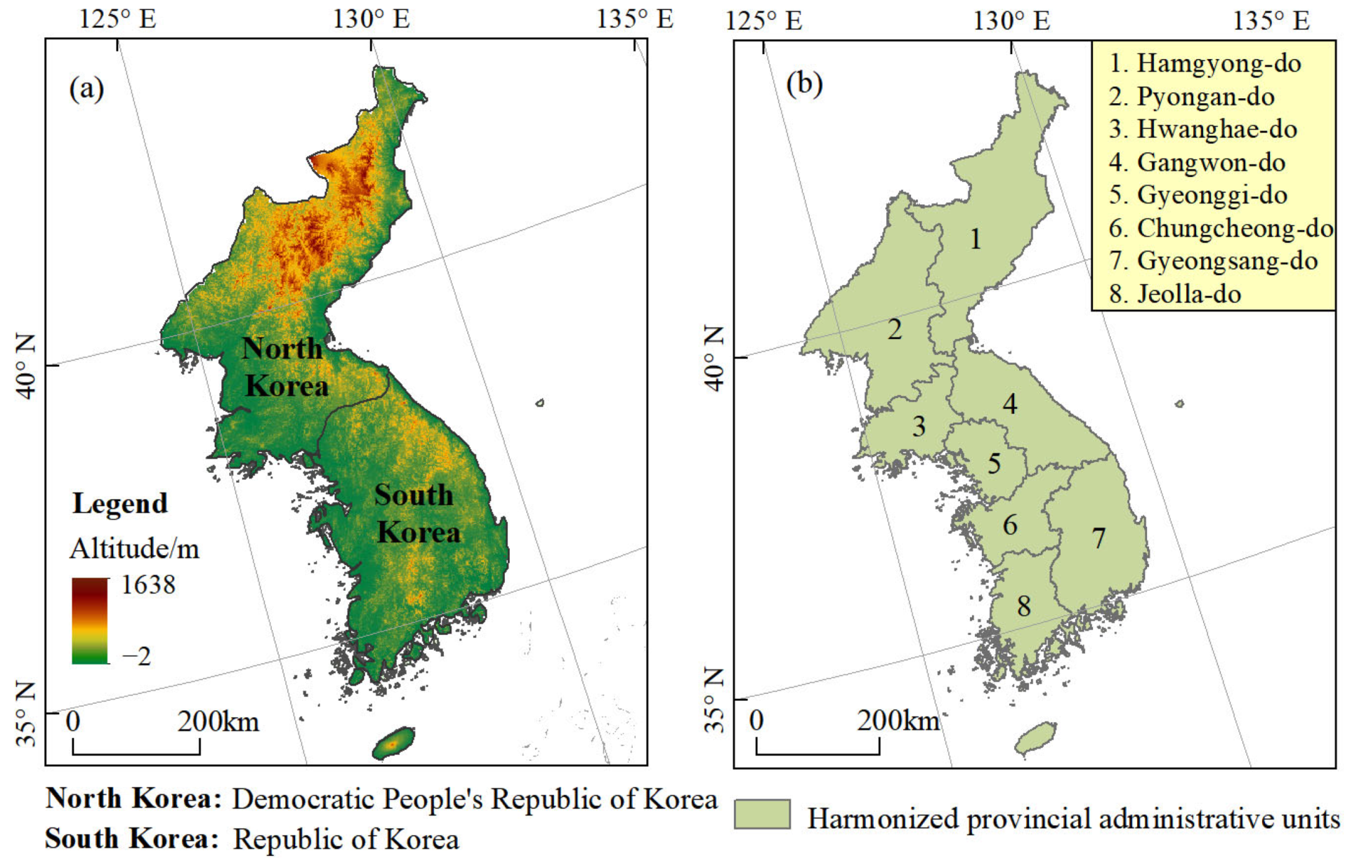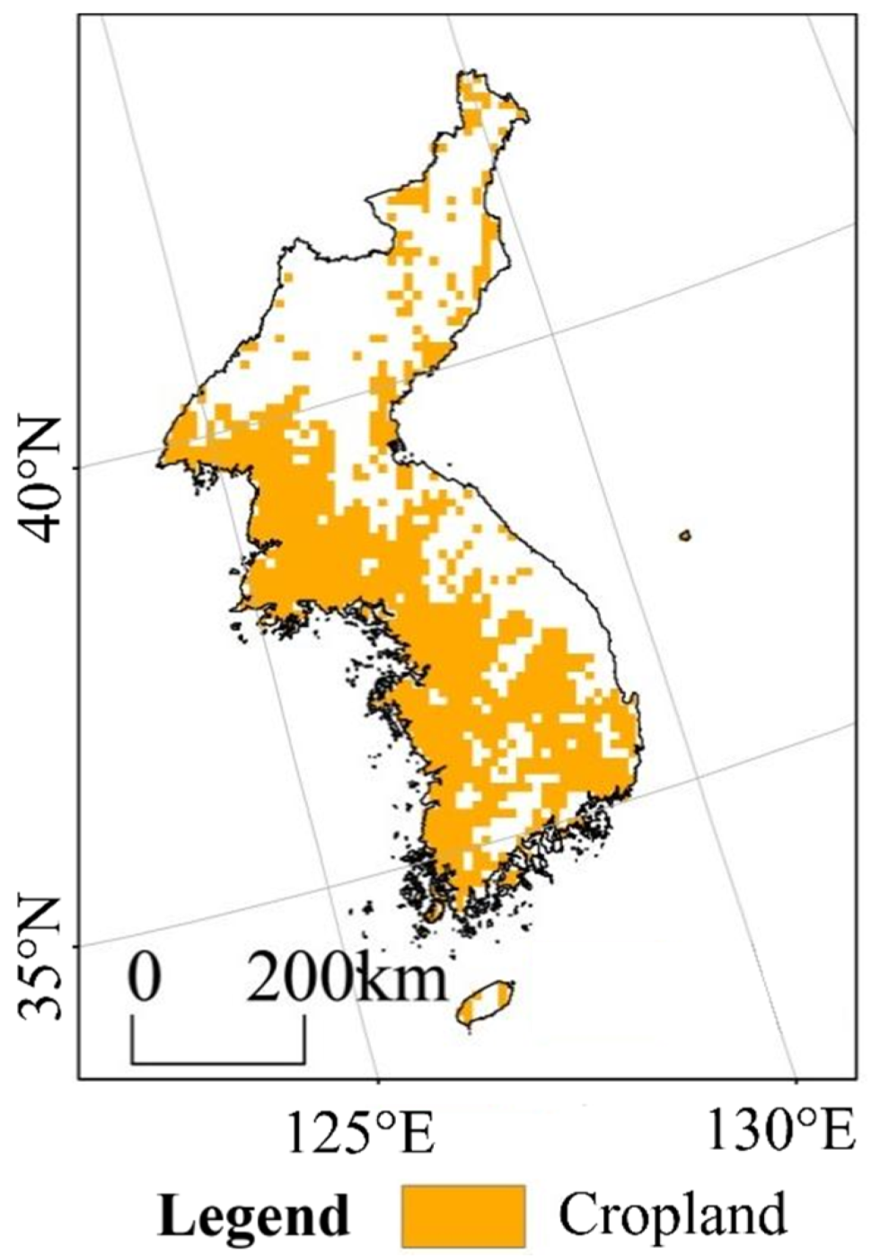 | Cropland statistical data | 1975–2000 | National | Statistics Korea (http://kosis.kr/statHtml/statHtml.do?orgId=101&tblId=DT_1EB001&language=en&conn_path=I3) (accessed on 15 July 2025); the Food and Agriculture Organization (FAO) of the United Nations |