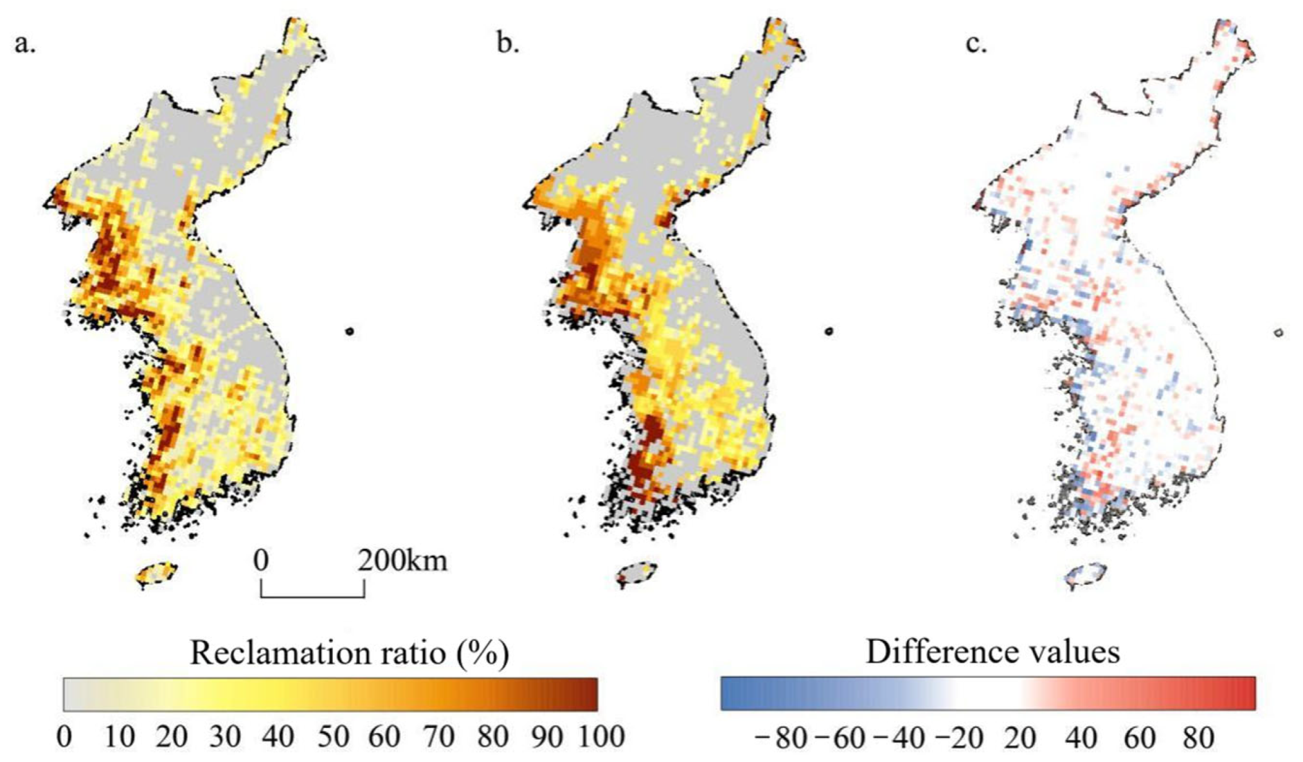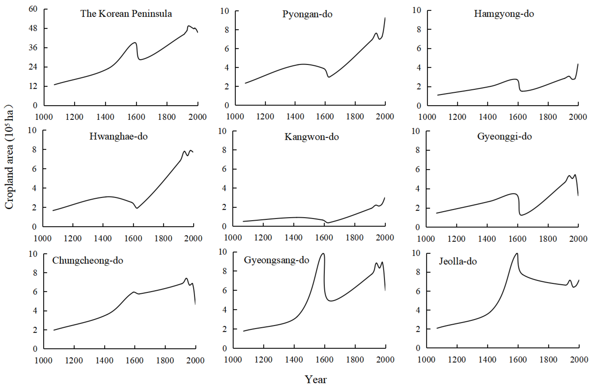 - Modern cropland statistical data from 1975 to 2000 for South Korea were obtained from Statistics Korea (http://kosis.kr/statHtml/statHtml.do?orgId=101&tblId=DT_1EB001&language=en&conn_path=I3) (accessed on 15 July 2025). For North Korea, cropland area data were primarily sourced from the Food and Agriculture Organization (FAO) of the United Nations. These datasets represent the most widely used and internationally harmonized time-series for comparative agricultural statistics.