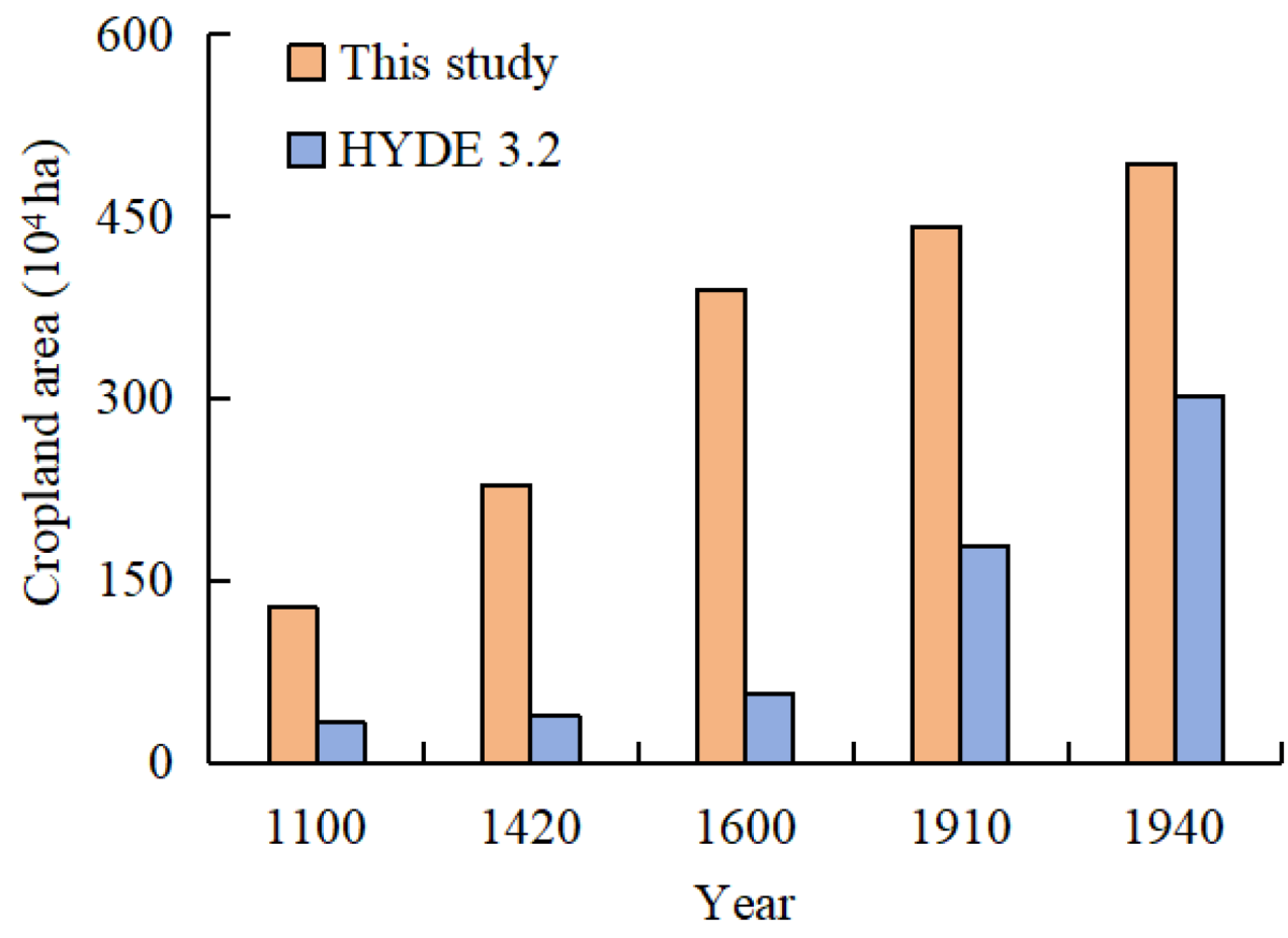 - Zhang, D.Y.; Fang, X.Q.; Yang, L.E. Comparison of the HYDE cropland data over the past millennium with regional historical evidence from Germany. Reg. Environ. Change 2021, 21, 15. [Google Scholar] [CrossRef]
