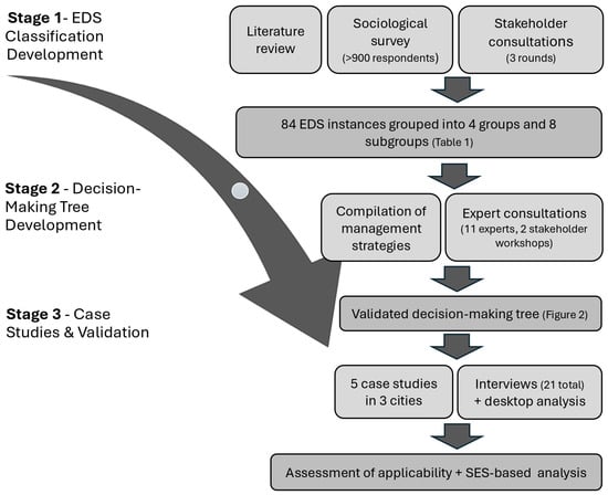 The study followed a three-stage research design (Figure 1): (1) development of the EDS classification, (2) construction of a decision-making tree, and (3) empirical validation through case studies.