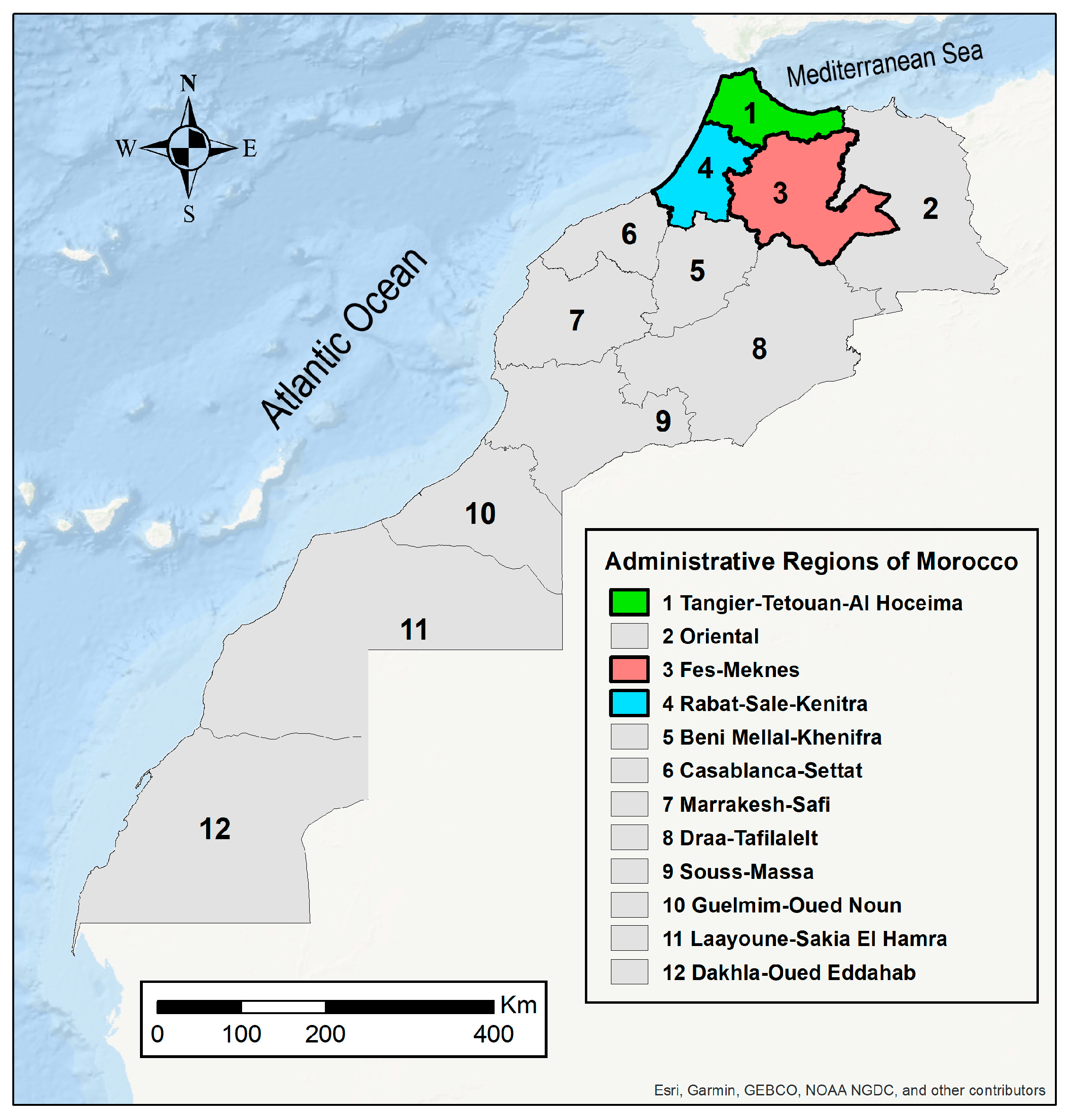 38]. In the TTH region, two flagship projects exemplify these efforts: the Asjen perimeter project, supplied by the Oued El Makhazine Dam, and the hydro-agricultural development of the Mhajrat Ajras perimeter downstream of the Oued Martil Dam [