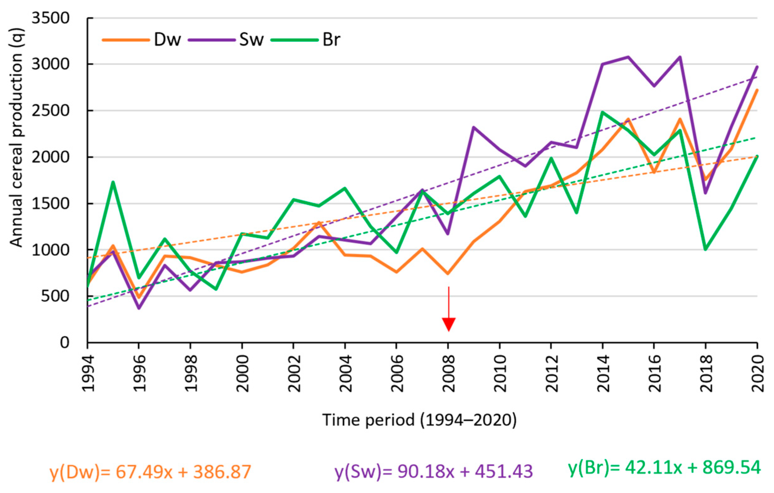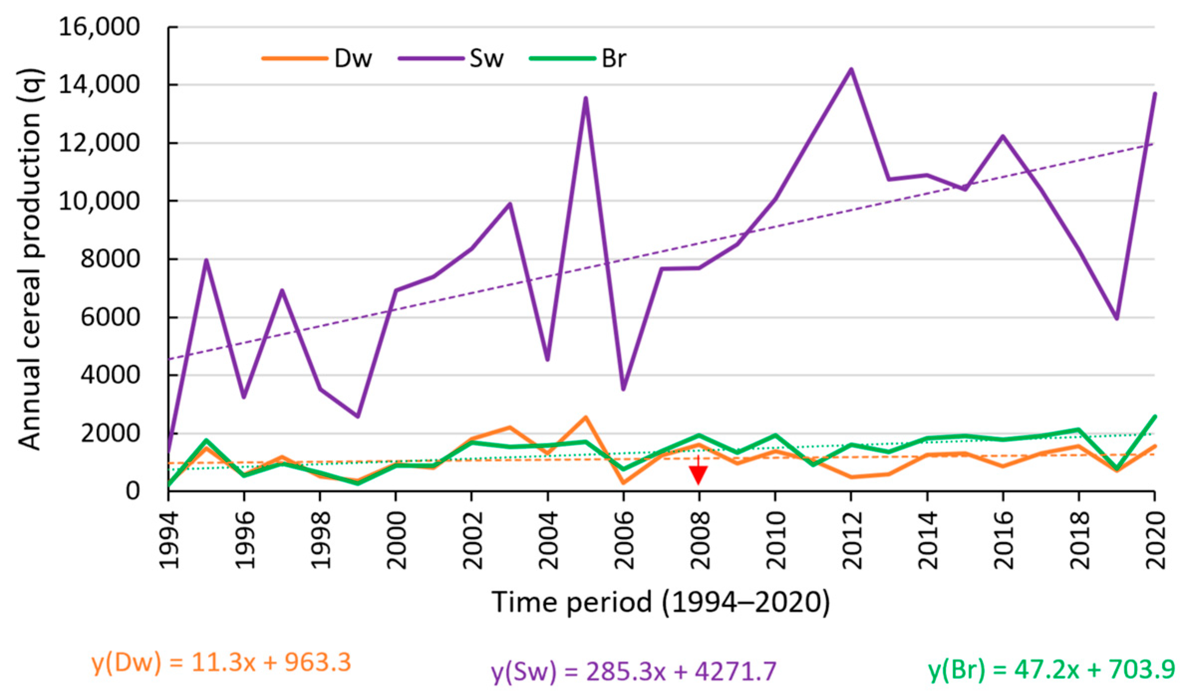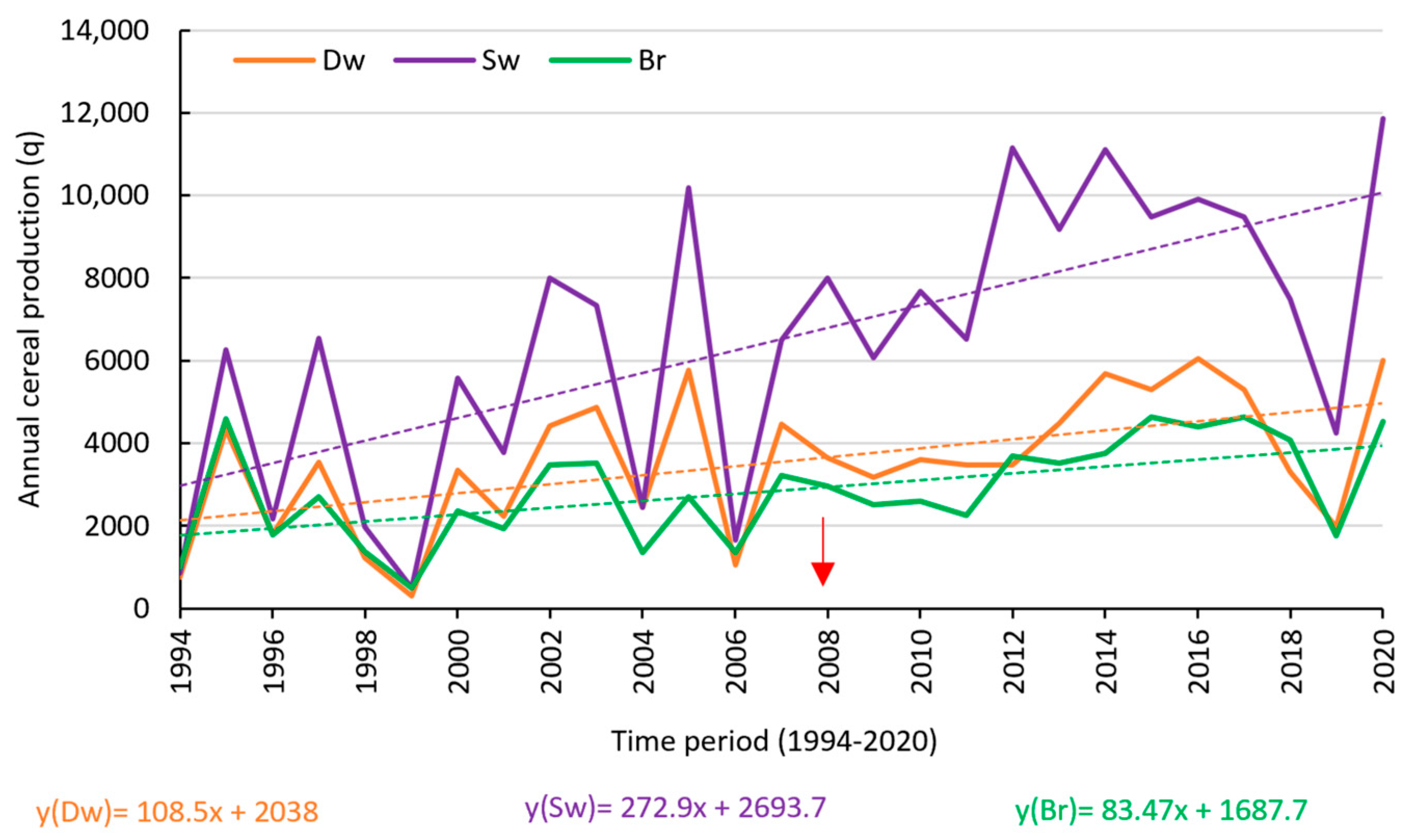 Figure 2) shows consistent upward trends for all three cereals: durum wheat (Dw), soft wheat (Sw), and barley (Br), though at varying rates. On average, Dw increased by 67.5 quintals/year, Br by 42.1 quintals/year, and Sw, the most widely cultivated cereal [