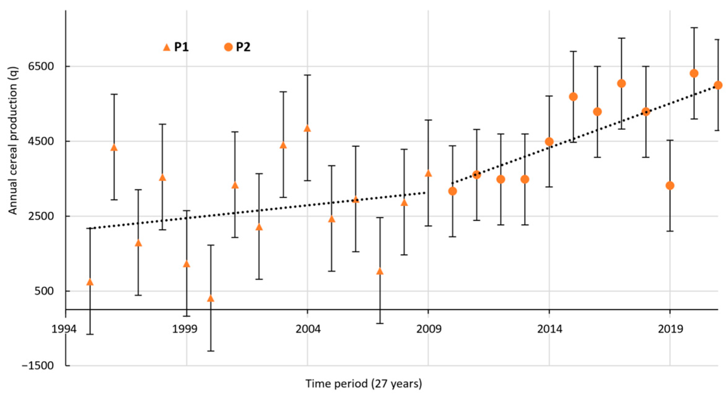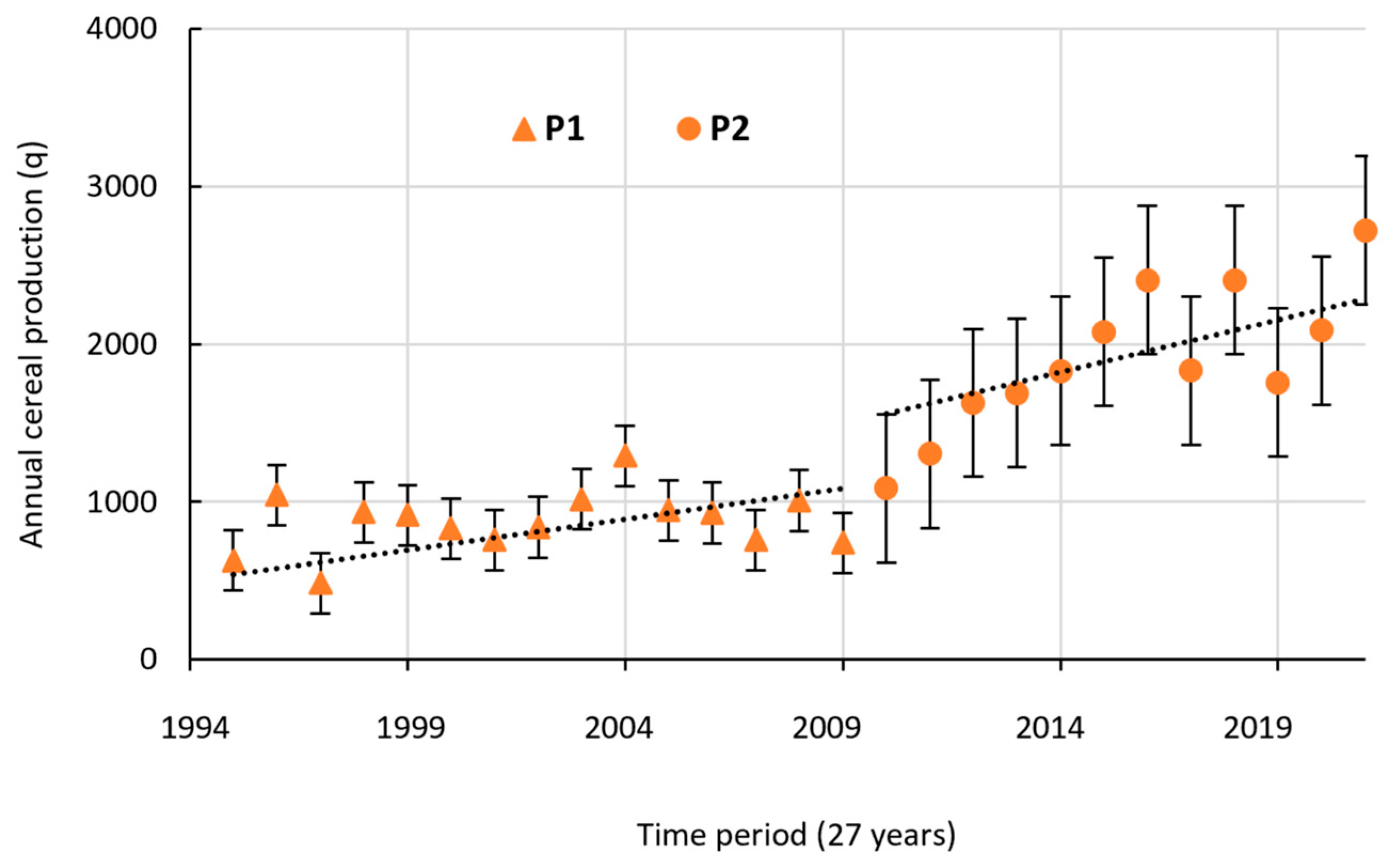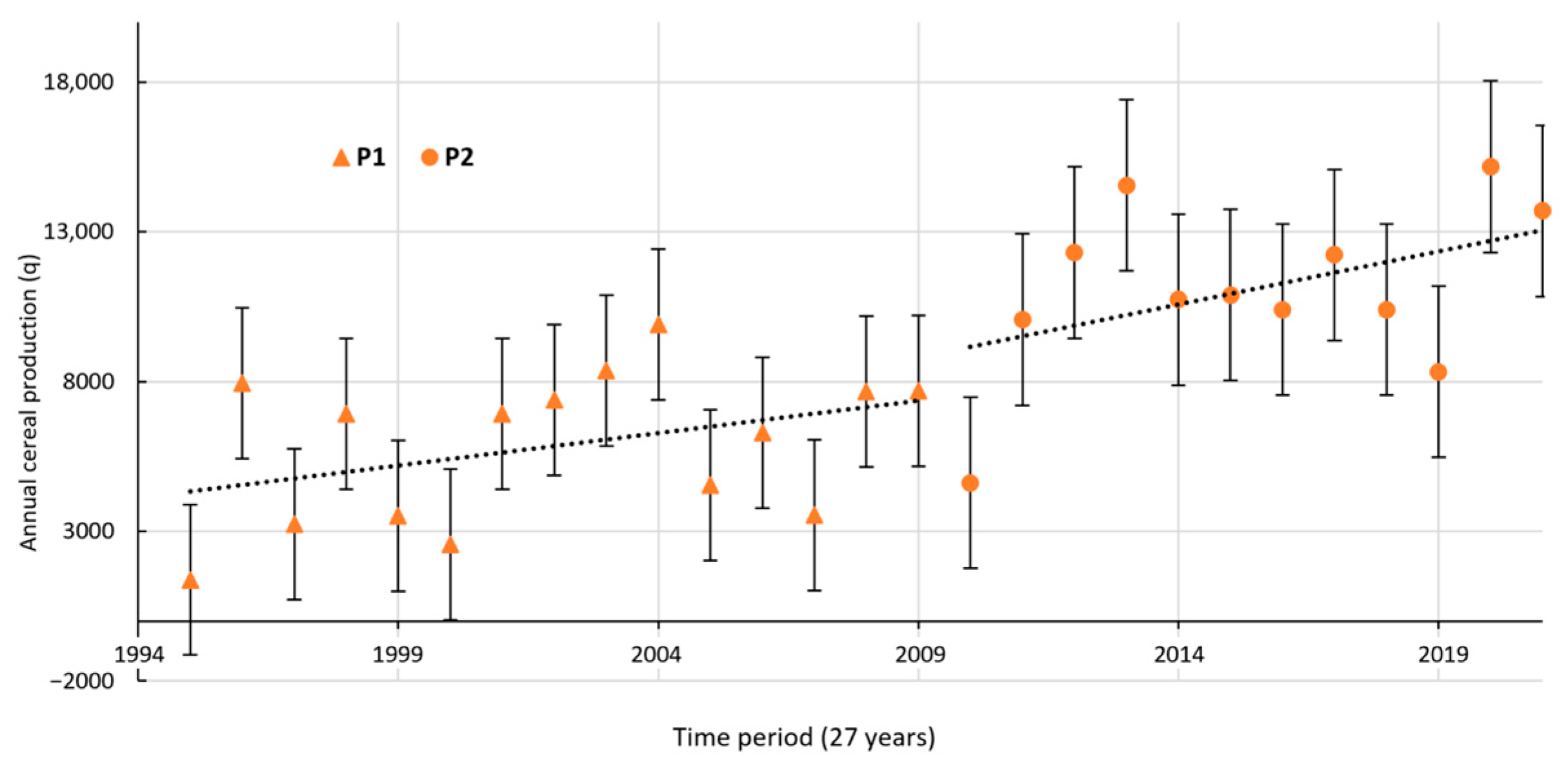 Based on the K-S segmentation, the time series were divided into two distinct sub-periods: P1 (1994–2008) and P2 (2009–2020). The mean annual cereal production increased substantially between the two periods, 117.3% for durum wheat, 153% for soft wheat, and 53.1% for barley (