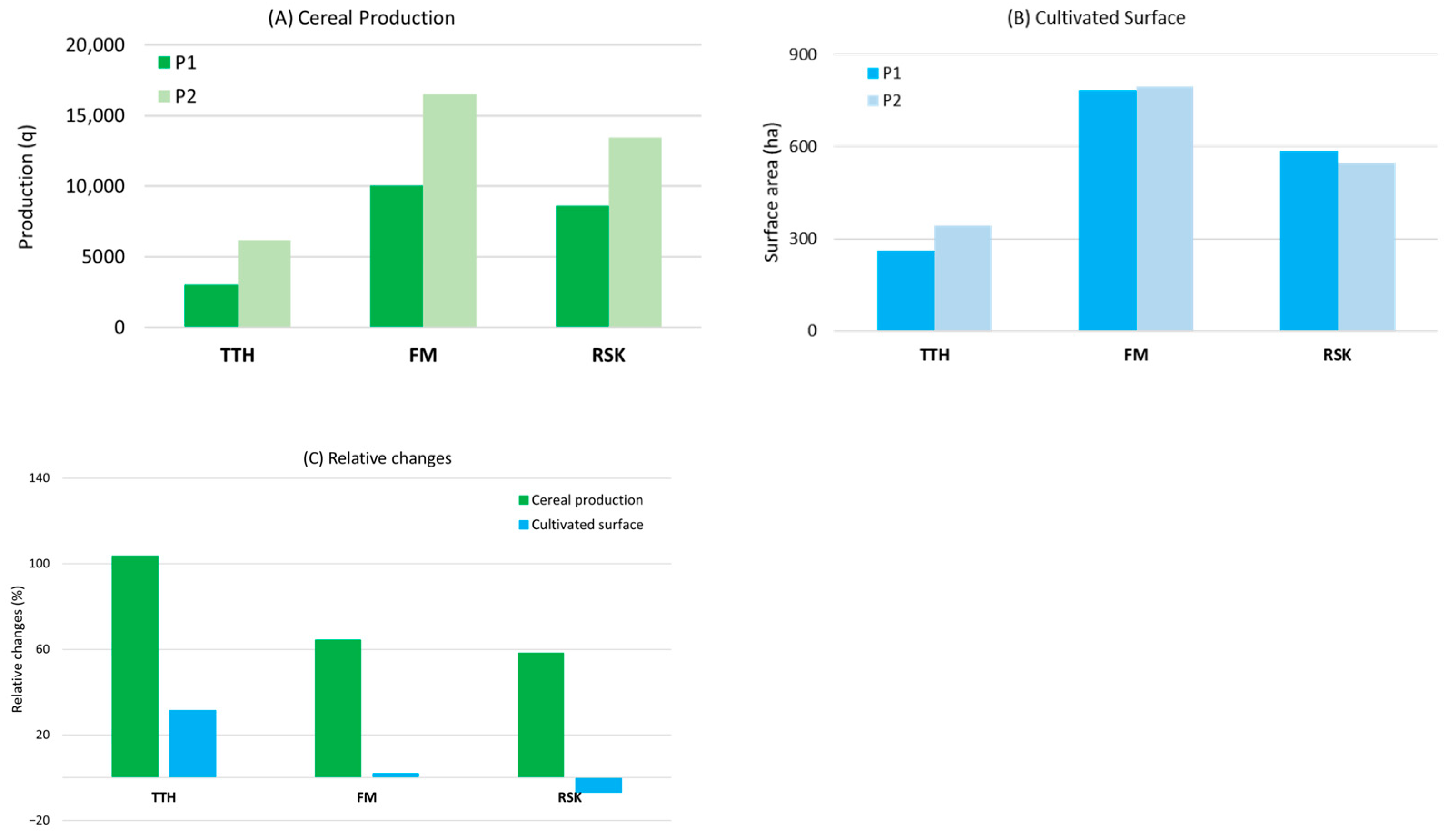 A substantial rise in total annual mean production for all three types of cereal is observed during P2, with increases of +64% in FM, +56% in RSK, and +104% in TTH, while cultivated areas have undergone a moderate expansion, except for RSK. The total annual mean area for all cereals has expanded by (+1.94%) for FM and (+31.47%) for TTH, whereas RSK experienced a modest decline (−6.75%) (