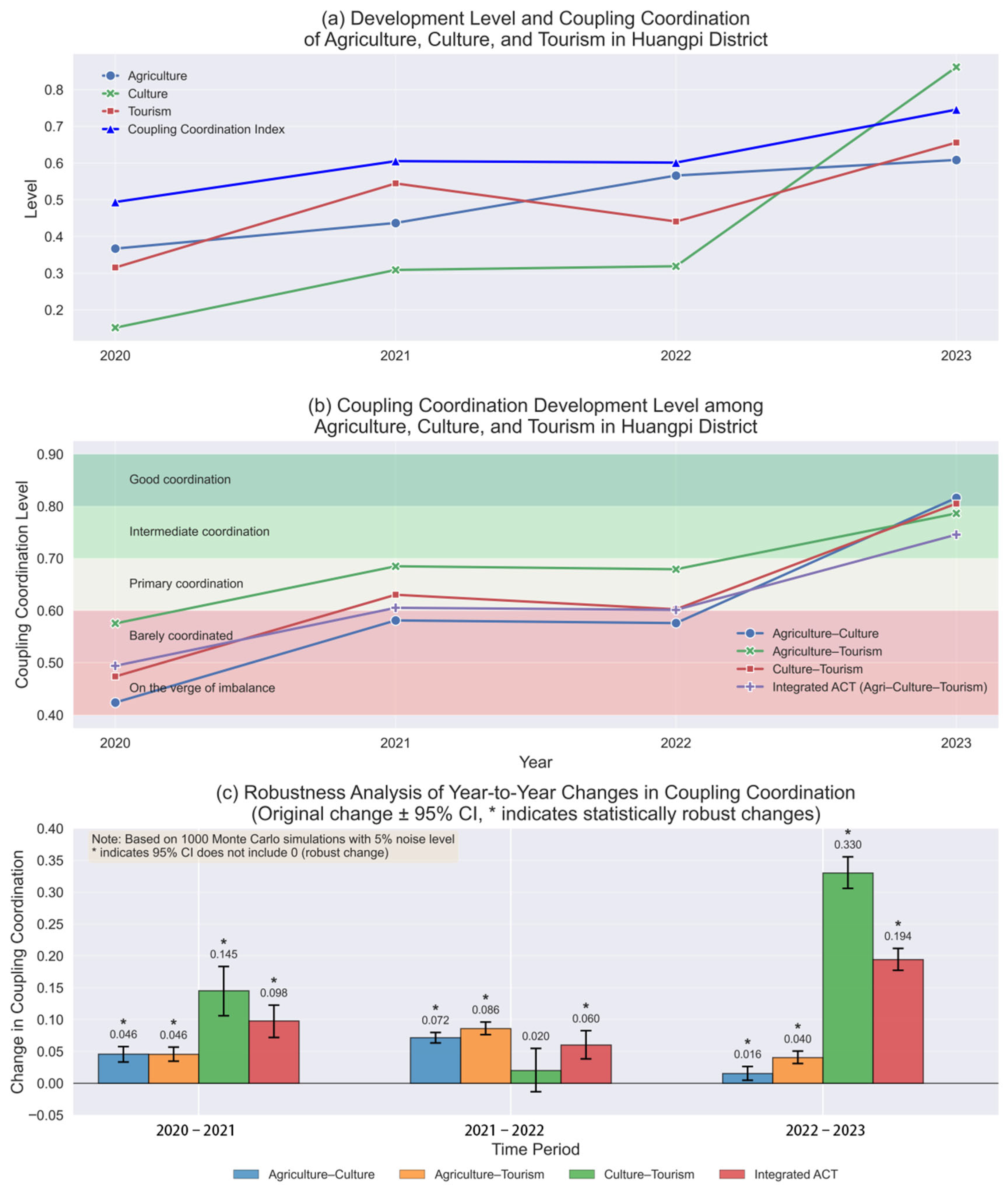 - Development environment demonstrated a J-shaped growth pattern, also reaching 1 in 2023, substantially supported by concrete policy measures. These included municipal-level stimuli such as the distribution of tourism consumption vouchers and travel benefit cards [95], as well as district-level relief efforts. Notably, Huangpi District implemented a loan interest subsidy program for key cultural and tourism enterprises in 2022 [96], a direct financial support measure guided by provincial-level recovery policies [97]. These multi-layered interventions helped sustain business operations during the downturn and primed the market for recovery.