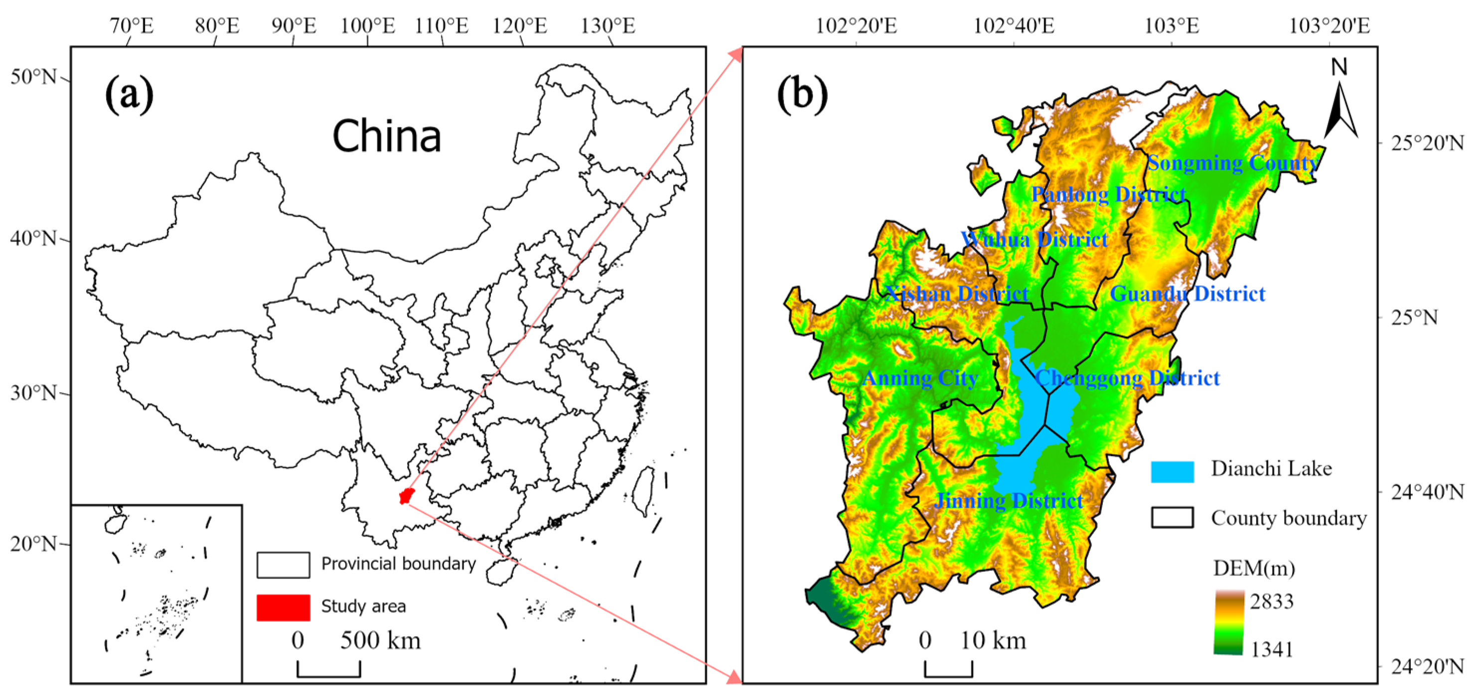 - Zhang, Z.; Li, J.; Lu, Y.; Yang, L.; Hu, Z.; Li, C.; Yang, X. Temporal and spatial changes in land use and ecosystem service value based on SDGs’ reports: A case study of Dianchi Lake Basin, China. Environ. Sci. Pollut. Res. 2022, 30, 31421–31435. [Google Scholar] [CrossRef]