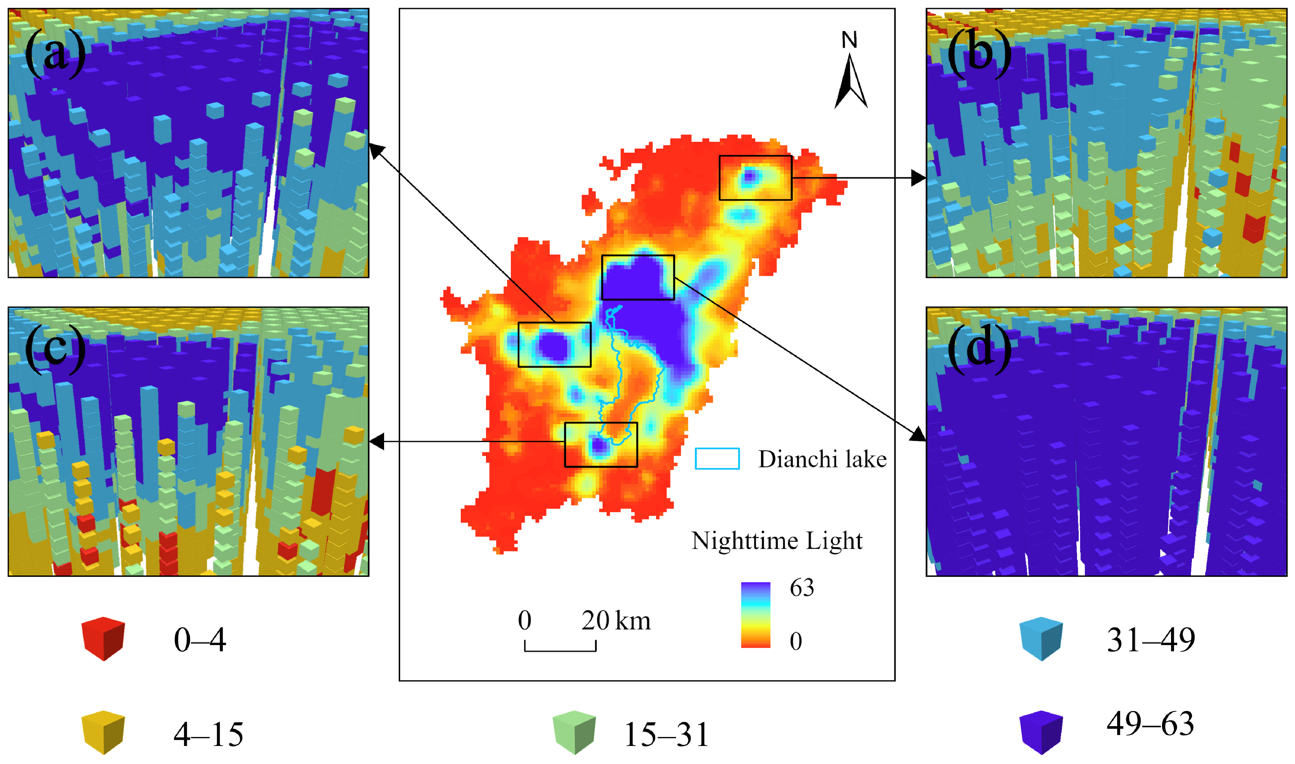 - Wang, C.; Qin, H.; Zhao, K.; Dong, P.; Yang, X.; Zhou, G.; Xi, X. Assessing the Impact of the Built-Up Environment on Nighttime Lights in China. Remote Sens. 2019, 11, 1712. [Google Scholar] [CrossRef]