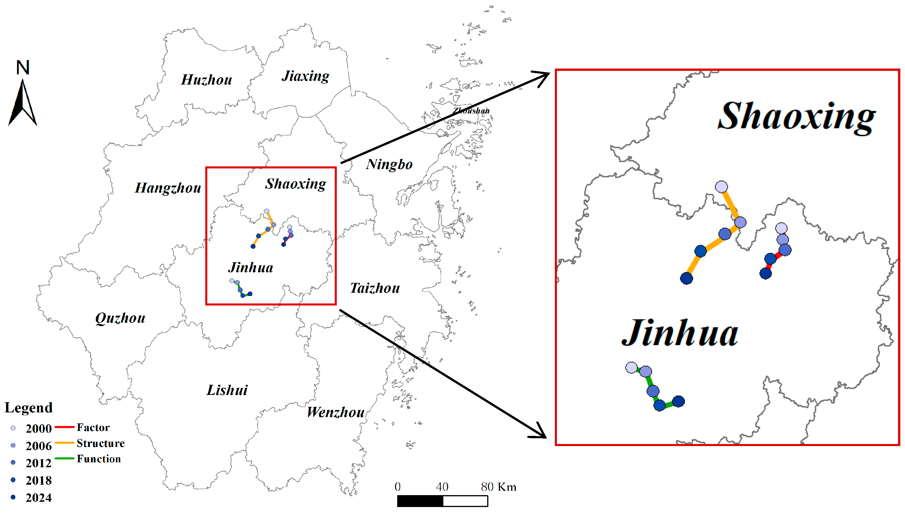- Zou, Y.; Meng, J.J.; Zhu, L.K.; Han, Z.Y.; Ma, Y.X. Characterizing land use transition in China by accounting for the conflicts underlying land use structure and function. J. Environ. Manag. 2024, 349, 119311. [Google Scholar]