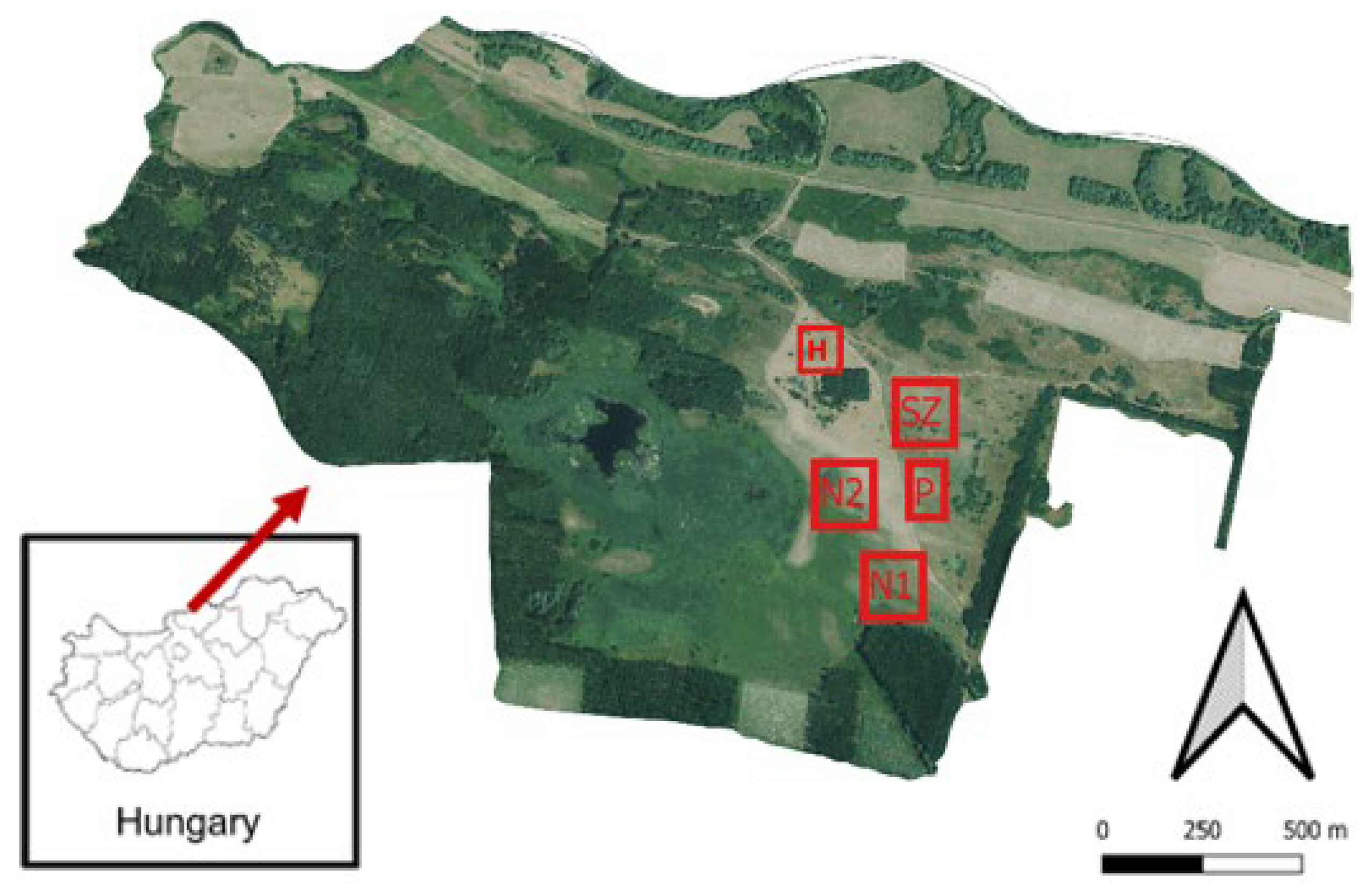 - Járdi, I.; Saláta, D.; S.-Falusi, E.; Stilling, F.; Pápay, G.; Zachar, Z.; Falvai, D.; Csontos, P.; Péter, N.; Penksza, K. Habitat Mosaics of Sand Steppes and Forest-Steppes in the Ipoly Valley in Hungary. Forests 2021, 12, 135. [Google Scholar] [CrossRef]