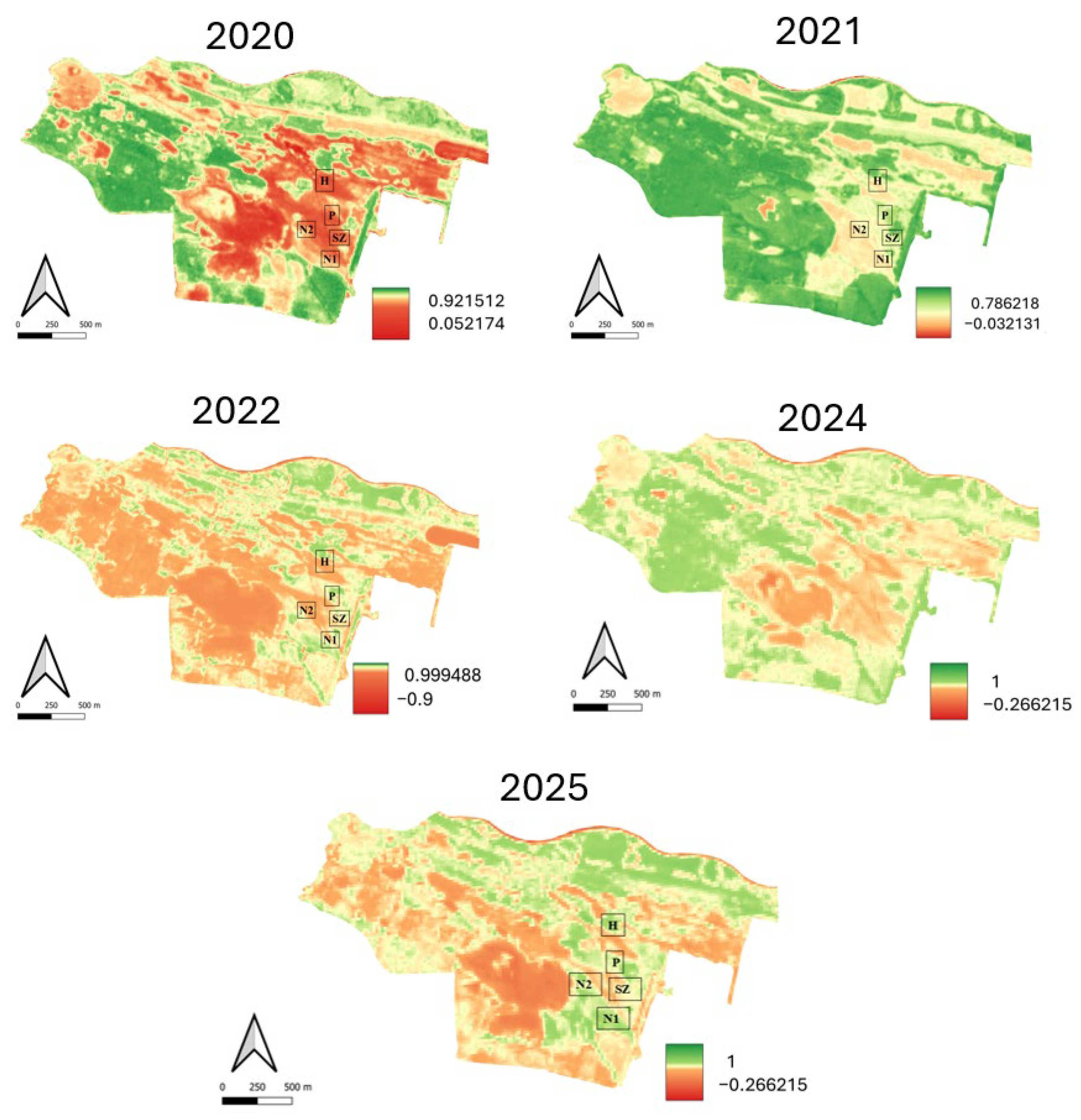 - Bartold, M.; Wróblewski, K.; Kluczek, M.; Dąbrowska-Zielińska, K.; Goliński, P. Examining the Sensitivity of Satellite-Derived Vegetation Indices to Plant Drought Stress in Grasslands in Poland. Plants 2024, 13, 2319. [Google Scholar] [CrossRef] [PubMed]