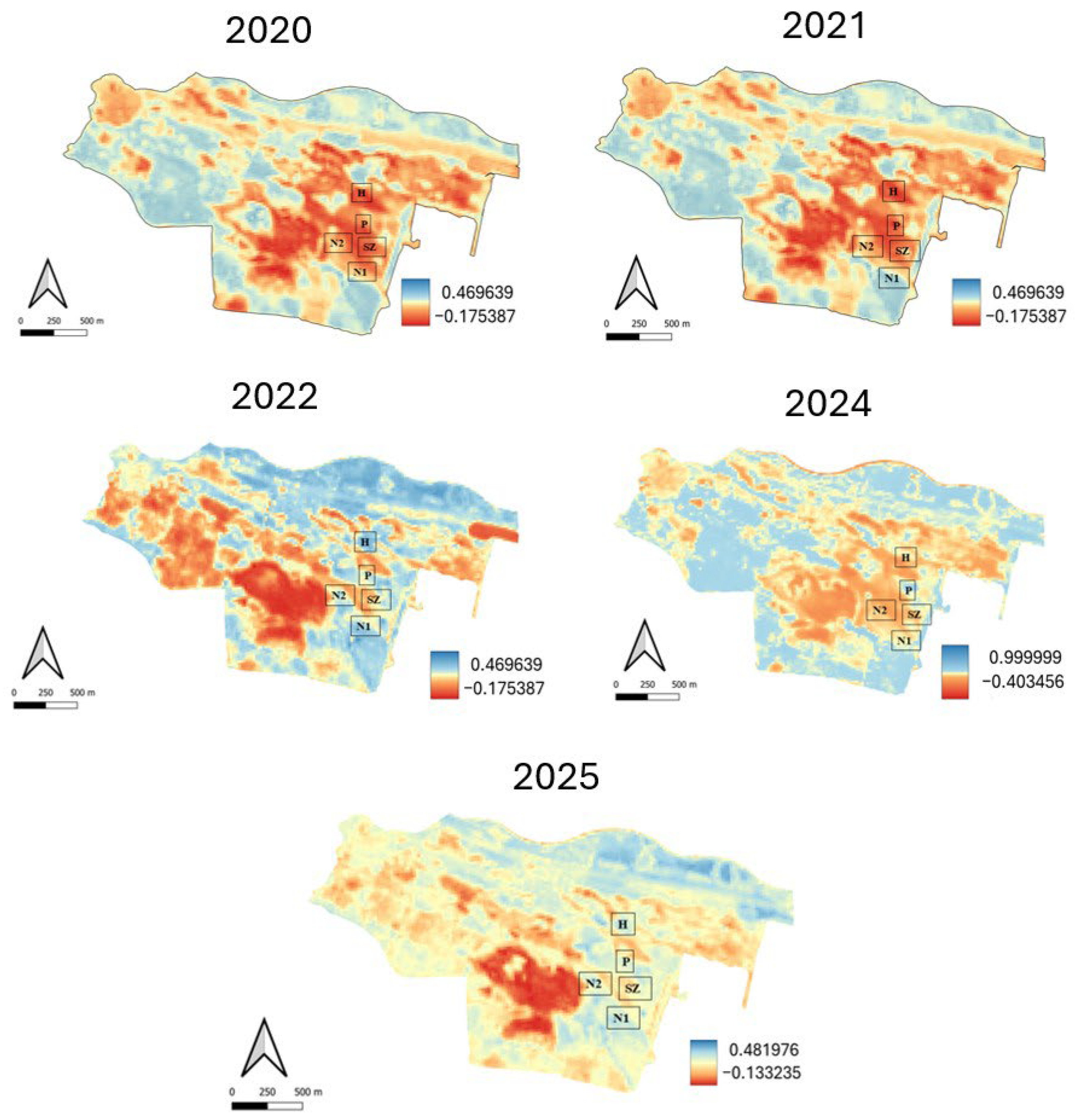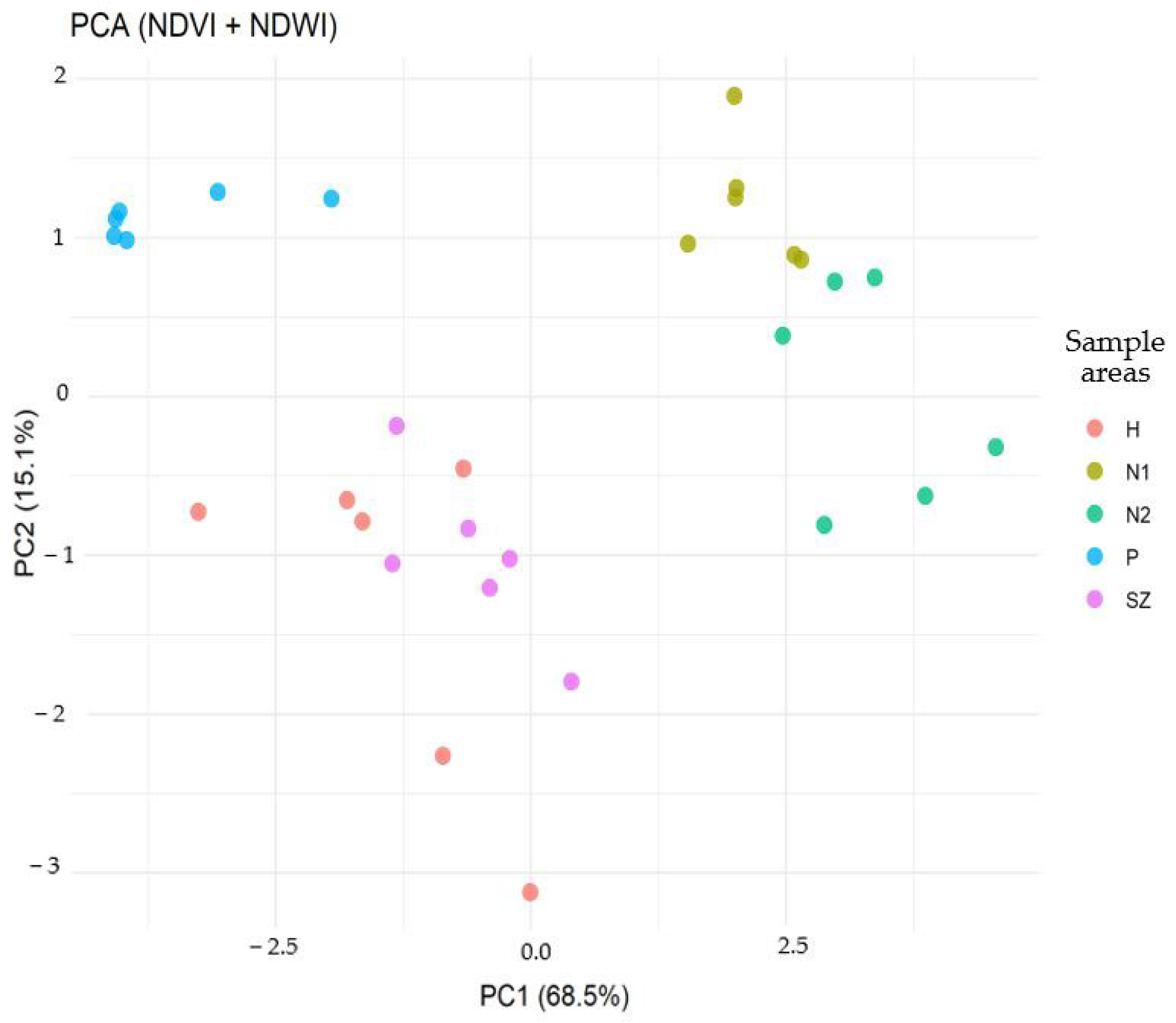 3.2. Principal Component Analysis (PCA) in Relation to Habitat Types and Vegetation Indices
