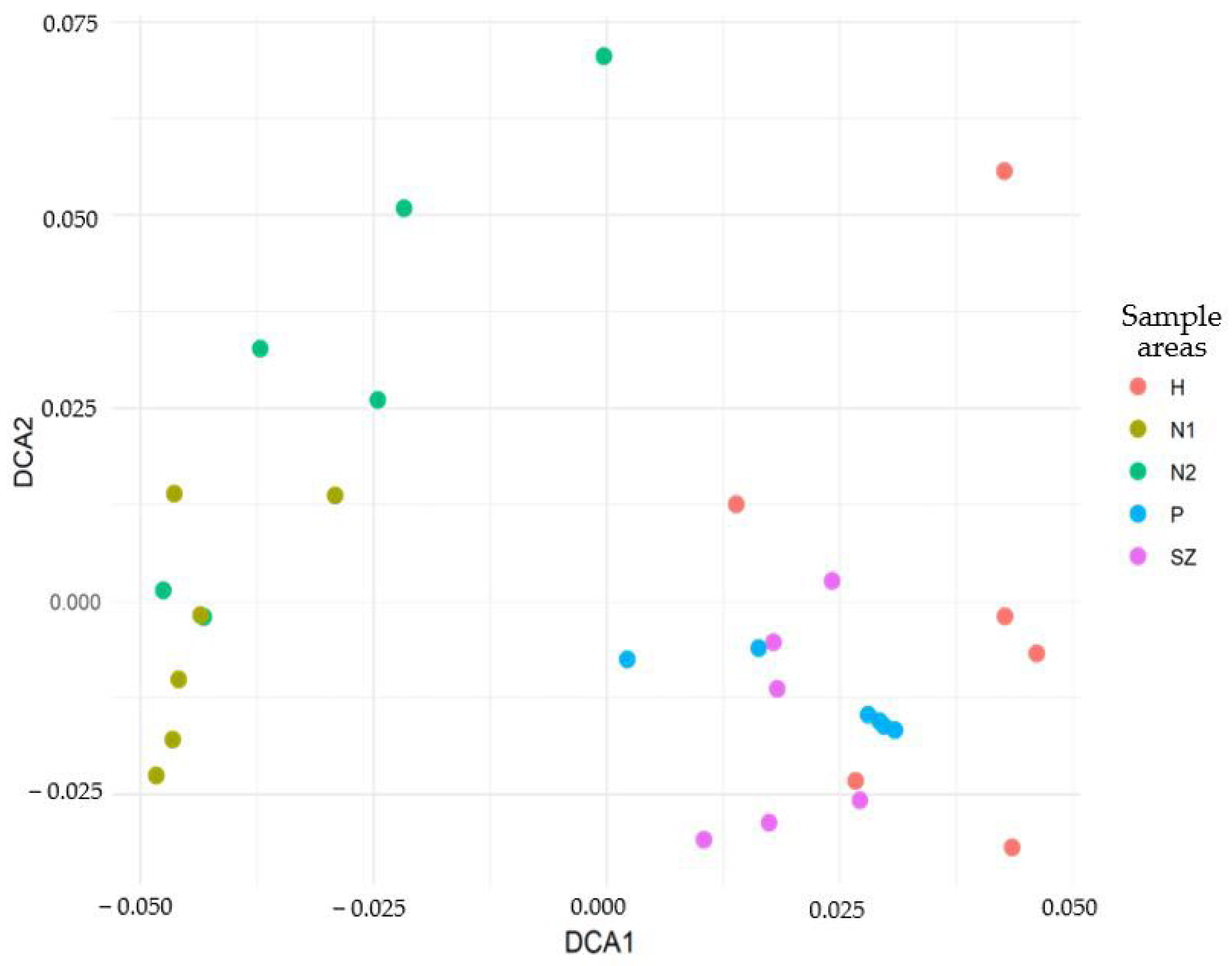 - Hill, M.O.; Gauch, H.G. Detrended Correspondence Analysis: An Improved Ordination Technique. Vegetatio 1980, 42, 47–58. [Google Scholar] [CrossRef]