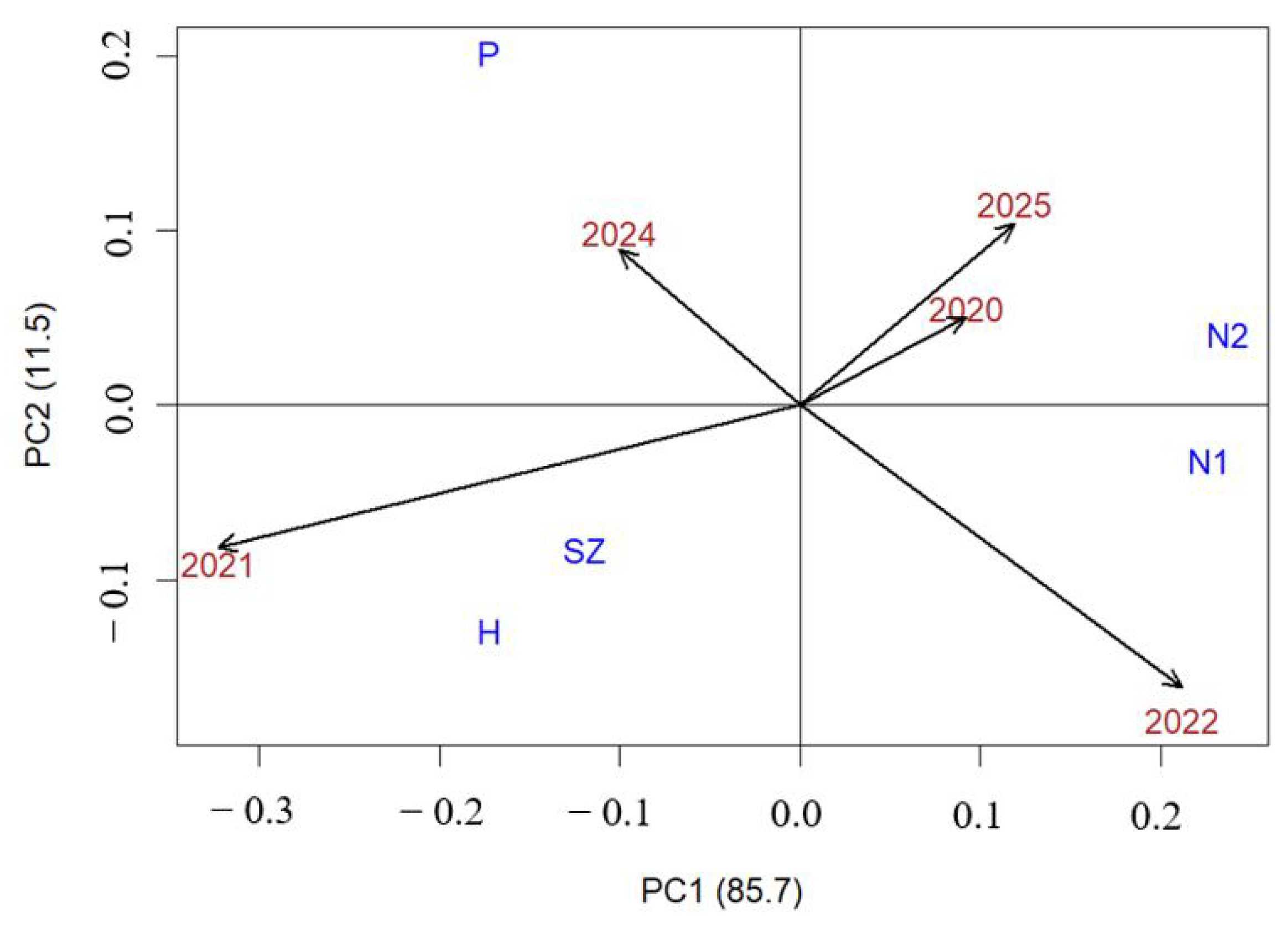 - Gauch, H.G., Jr. Statistical Analysis of Yield Trials by AMMI and GGE. Crop Sci. 2006, 46, 1488–1500. [Google Scholar] [CrossRef]