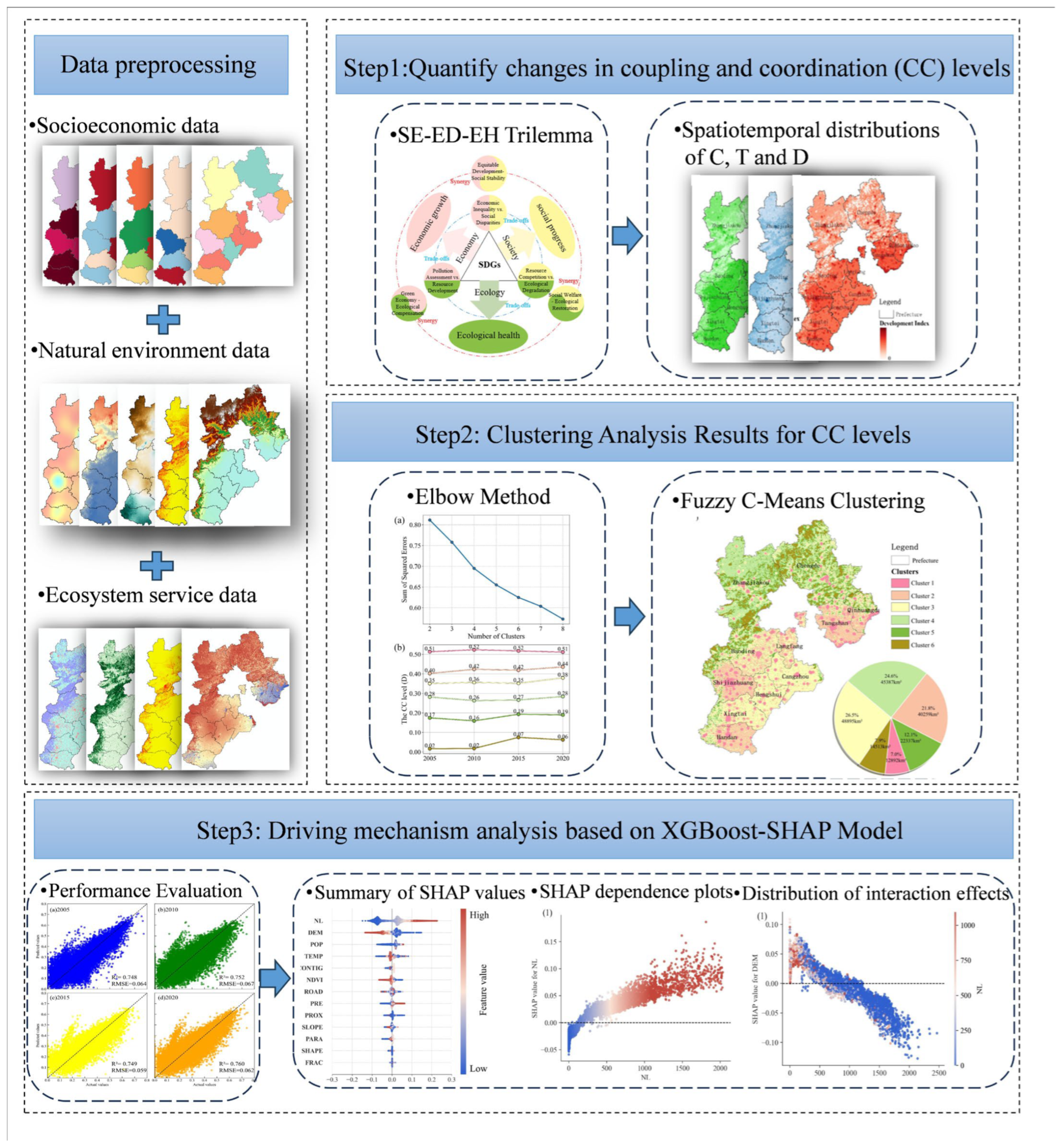APA StyleChen, Q., Sun, L., Zhang, Q., Zhou, K., Wang, J., Bi, J., Wang, W., Lu, Y., Qu, G., & Lu, S. (2026). Explainable Machine Learning for Evaluating Coupling and Coordination of the Sustainability Trilemma: A Case Study of Hebei Province. Land, 15(1), 73. https://doi.org/10.3390/land15010073