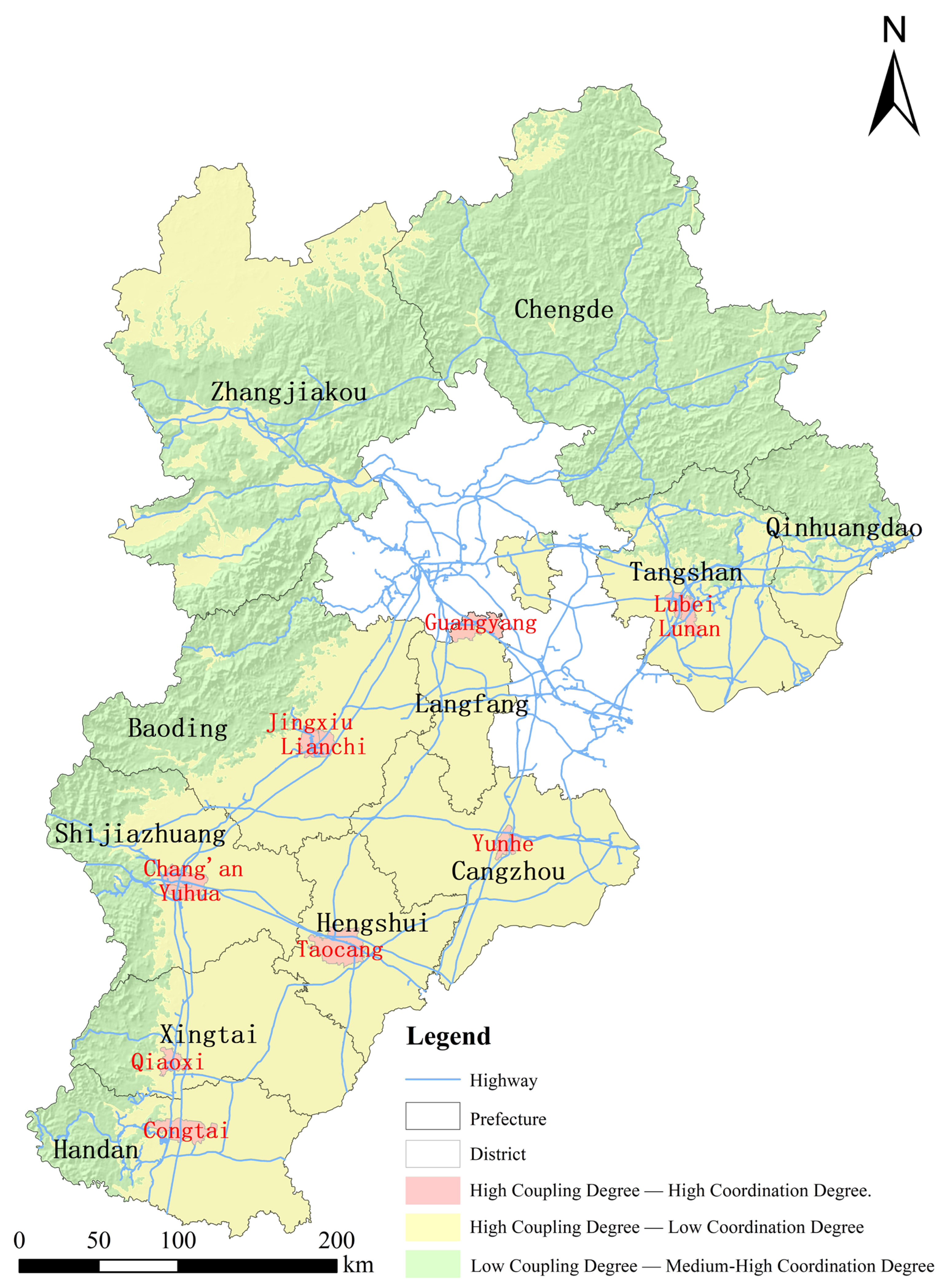- Li, H.; Wang, Q.; Zang, X.; Gao, T.; Gu, H. Spatiotemporal differentiation and influencing factors of the degree of resilience coupling coordination in the Beijing–Tianjin–Hebei region. Sci. Rep. 2024, 14, 26394. [Google Scholar] [CrossRef]