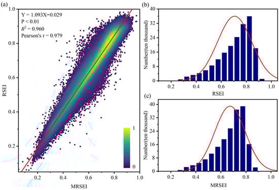 Comparison of RSEI and MRSEI results in the study area in 2022. (a) Correlation between MRSEI and RSEI, (b) Frequency Distribution of MRSEI, (c) Frequency Distribution of RSEI.