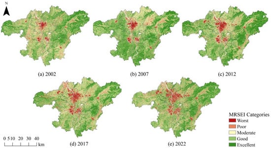 Table 3 presents the results of principal component analysis (PCA) for the Chang–Zhu–Tan Metropolitan Area over different periods. From 2002 to 2022, the contribution rate of the first principal component (PC1) remained stable at approximately 80%, effectively capturing the majority of the characteristic information from an extensive spectrum of indicators. Among them, the NDVI and WET indices showed positive values, suggesting a positive impact on the ecological environment of the study area. Nonetheless, the NDBSI, LST, and DI indices yielded negative values, reflecting adverse effects on the environment. This aligns with real-world observations. Overall, PC1 integrated the most relevant information for the MRSEI. Simultaneously, this index avoided the subjectivity inherent in manually assigning weights in a weighted average calculation. As a consequence, constructing the MRSEI grounded in features extracted from PC1 is both rational and scientifically desirable.