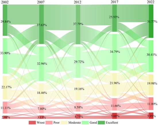 The MRSEI data is predominantly concentrated between 0.3 and 0.8, with a particularly dense distribution between 0.45 and 0.75, which follows a normal distribution. On the basis of relevant literature, the EEQ is divided into five levels: poor [0, 0.45), relatively poor [0.45, 0.55), moderate [0.55, 0.65), good [0.65, 0.75), and excellent [0.75, 1]. As evidenced by the overall distribution (Figure 5), the spatial distribution of the EEQ generally exhibits a “low-center and high surrounding” spatial pattern in the Chang–Zhu–Tan Metropolitan Area. Specifically, the excellent and good ecological zones are principally located in the northeastern, northwestern, and southern key ecological barrier areas of the metropolitan region. These areas are rich in vegetation, with minimal human disturbance, and have a relatively stable ecological environment. In contrast, the poor and relatively poor ecological zones are primarily found in the central core areas of the metropolitan area, such as Yuhua District, Furong District, and Yuhu District. These regions are densely populated. Aside from that, human activities have significant negative impacts on the local ecological environment, ultimately leading to poor ecological quality. With regard to changes over time (Figure 6), in the core region of the Chang–Zhu–Tan Metropolitan Area, the proportion of poor and relatively poor zones increased from 14.09% to 17.84%. This indicates an outward expansion of areas with low and relatively low habitat quality. Meanwhile, the area percentage of excellent and good zones decreased from 63.74% to 62.18%. These zones are principally located in economically developed areas such as Changsha County, Ningxiang City, and Liuyang City.