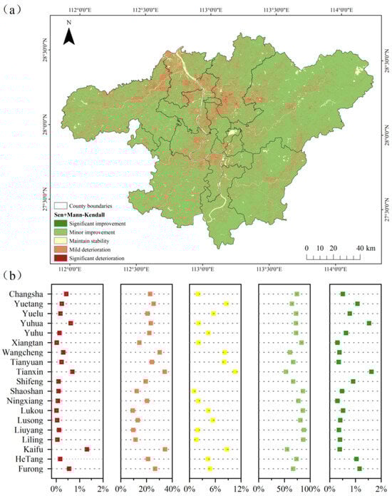 The spatial–temporal trend of EEQ in the Chang–Zhu–Tan Metropolitan Area from 2002 to 2022 was analyzed using the Theil–Sen median slope estimation and Mann–Kendall test. The results are demonstrated in Figure 7a. Overall, although there are some localized areas of degradation, EEQ in the research area has ameliorated. The area percentage of tremendously bettered zones is 0.44%, principally located in the northeastern mountainous regions of the study area, such as the eastern part of Liuyang City. The area percentage of slightly ameliorated zones is 80.10%, primarily concentrated in areas with dense vegetation cover, such as the southwestern part of Liling City and most of Lukou District. The area percentage of stable zones is 3.01%, mainly located in river and lake areas. Slightly degraded zones, which account for 16.29% of the area, are primarily located within the built-up areas of the Chang–Zhu–Tan Metropolitan Area. Substantially degraded zones account for only 0.15% of the area and are primarily located in the central core development areas. In these zones, rapid urban expansion has destroyed surface vegetation, leading to a continuous deterioration of the EEQ.