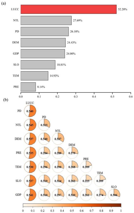 The results of the single-factor analysis demonstrate that the ecological environment quality is influenced by both natural and human factors in the Chang–Zhu–Tan Metropolitan Area (Figure 8a). Overall, human factors have a more remarkable explanatory power on EEQ than natural factors. Land use type was the strongest predictor of EEQ changes, with the highest q-value of 0.522 among all factors. On this basis, the factors with significant influence encompass NTL, PD, DEM, GDP, SLO, and TEM, while PRE exerted the least substantial impact on the EEQ of the study area, with a q-value of only 0.0814, which can be considered negligible.