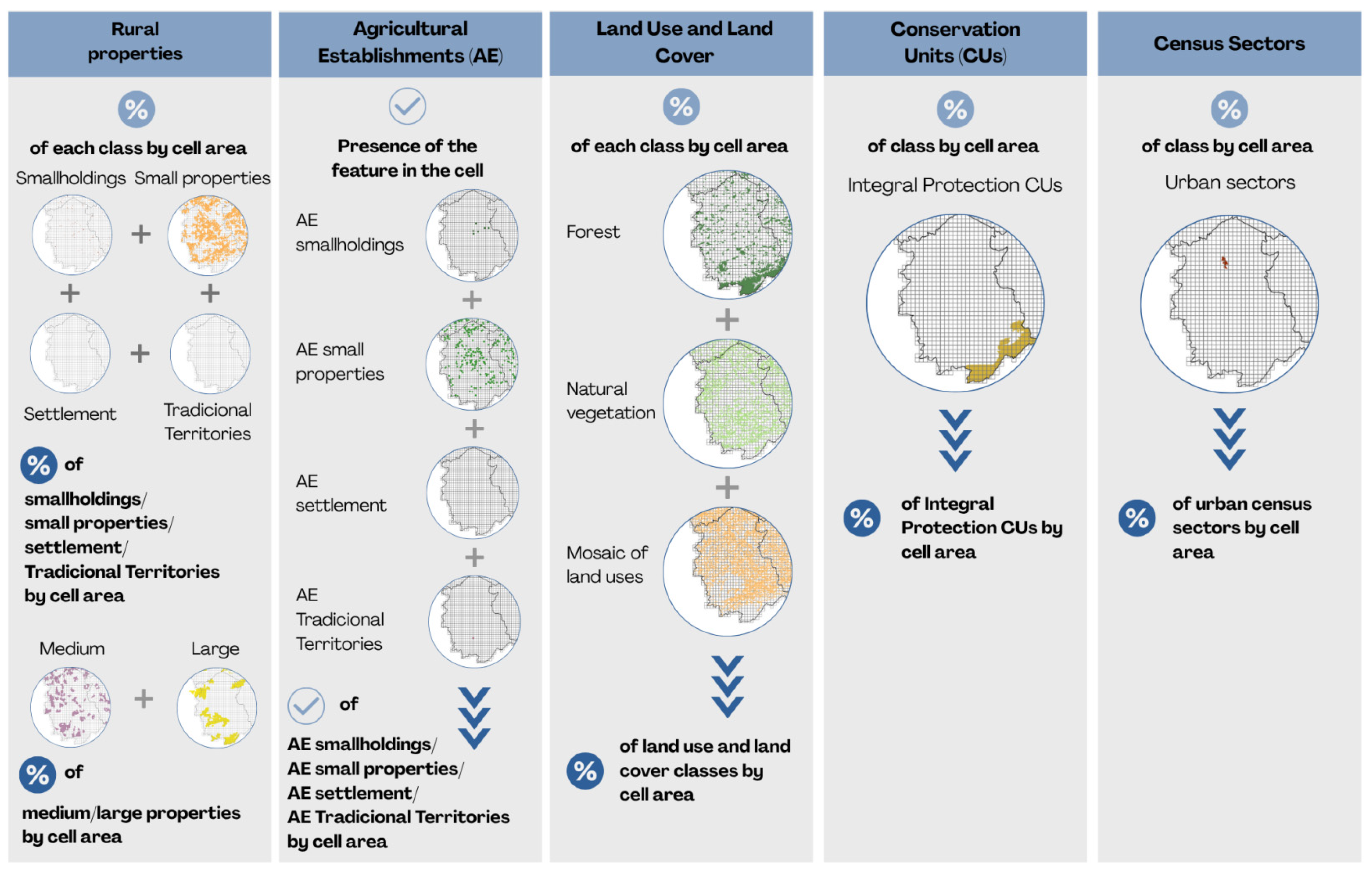 - V—Dimensions used to determine potential areas for peasant primary production: area in km2 of land use and land cover classes, number of agricultural establishments (small and small farms), and the area in km2 of small, small, medium, and large rural properties;