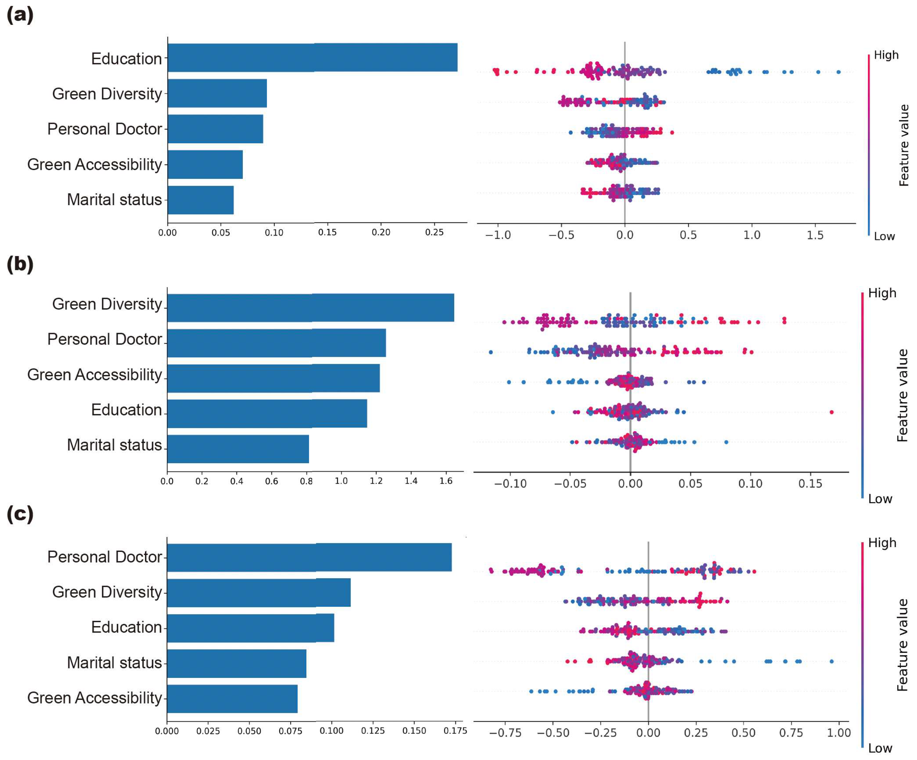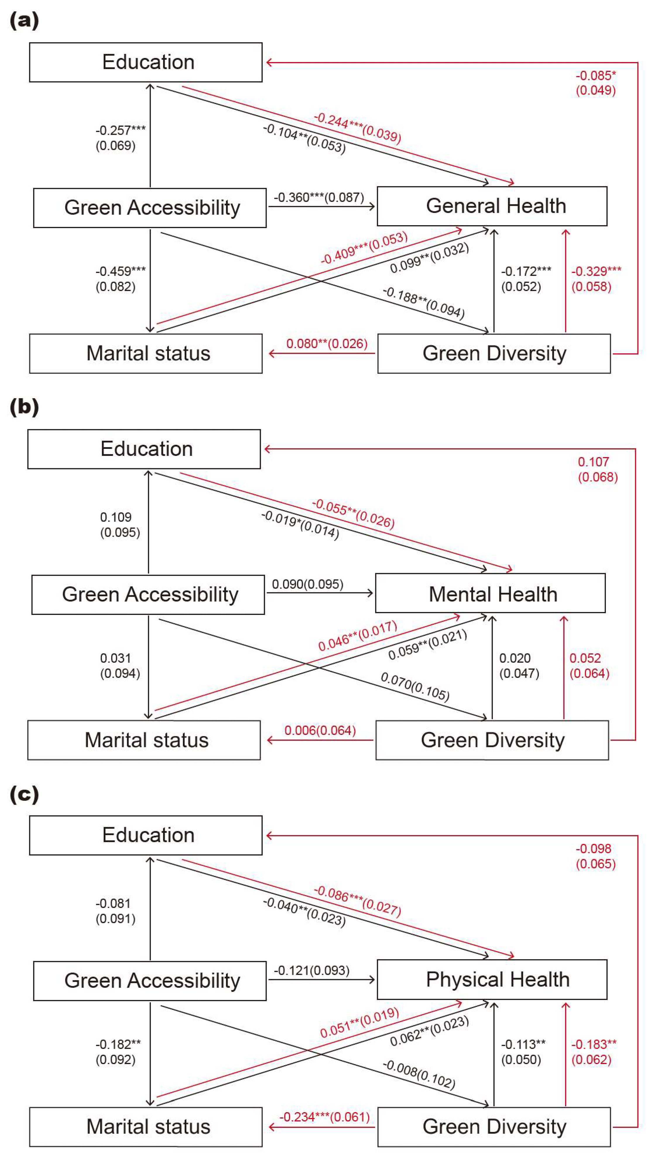| Green Accessibility => Marital Status => General Health | Green Accessibility => Education => General Health | Green Accessibility => Green Diversity => General Health | Green Diversity => Marital Status => General Health | Green Diversity => Education => General Health | |