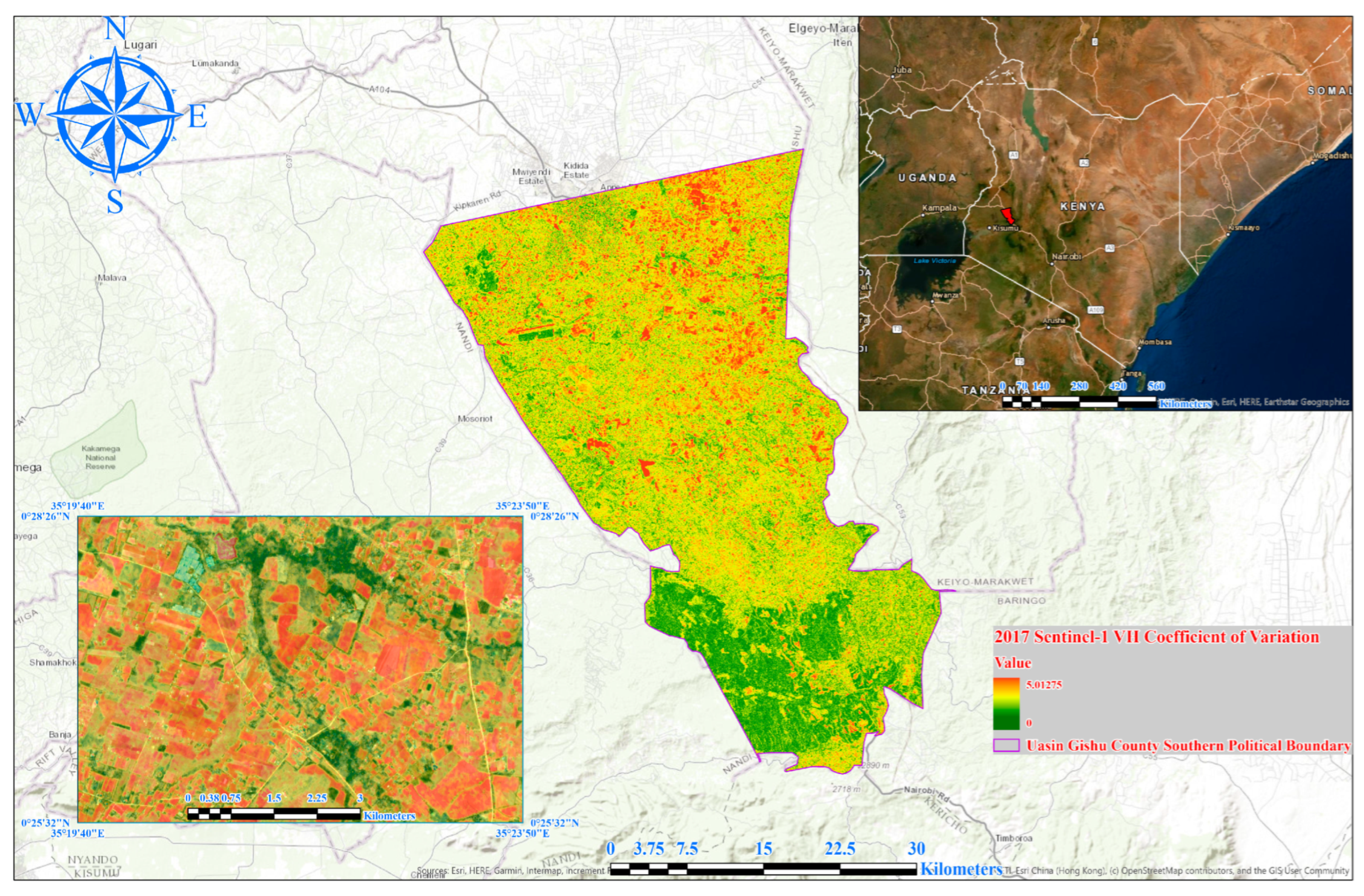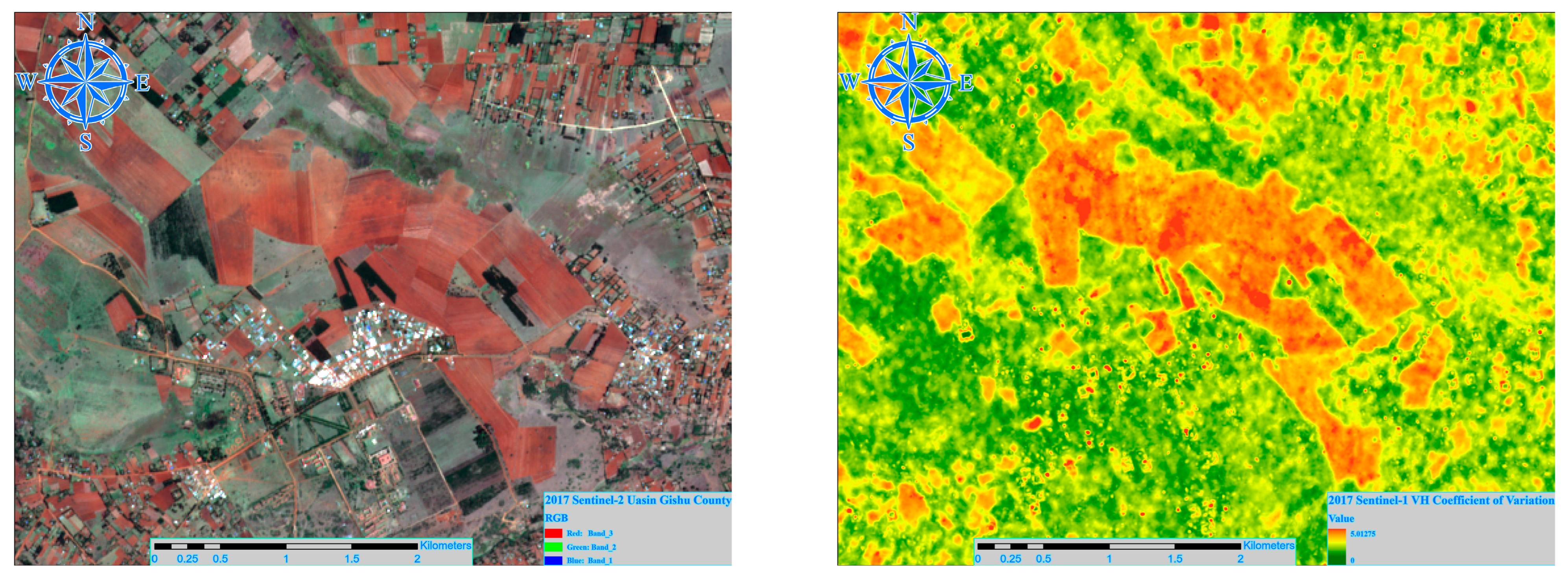 12]. For validation, ESA’s Sentinel-2 multispectral imagery provided optical reference data comprising 12 bands at spatial resolutions of 10, 20, and 60 m, with a 10-day temporal resolution. A 2015 crop mask of Kenya, obtained from ArcGIS Online, was used to identify known agricultural areas [