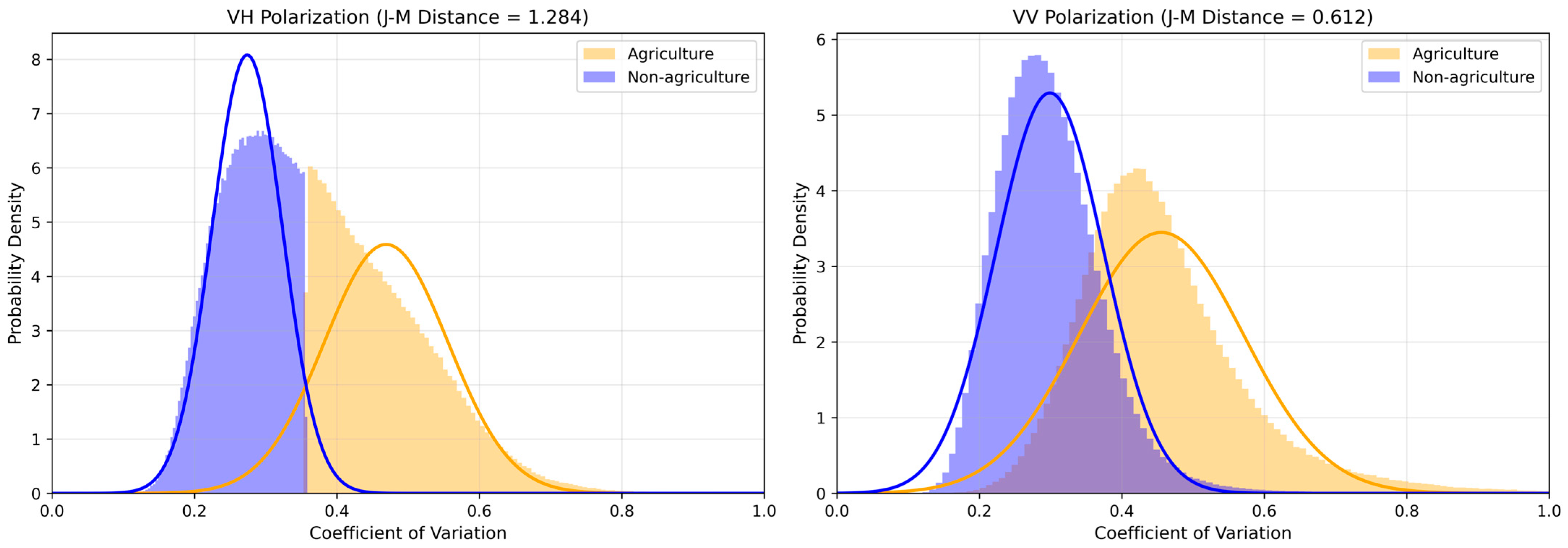 Active agriculture pixels (n = 581,807) exhibited CV values with a mean of 0.469 (SD = 0.087), while non-agricultural pixels (n = 623,484) showed a mean CV of 0.274 (SD = 0.049). The higher mean and wider distribution for agricultural areas reflect the substantial temporal variability in backscatter associated with crop planting, growth, and harvest cycles. The tighter distribution for non-agricultural areas indicates more temporally stable land cover.