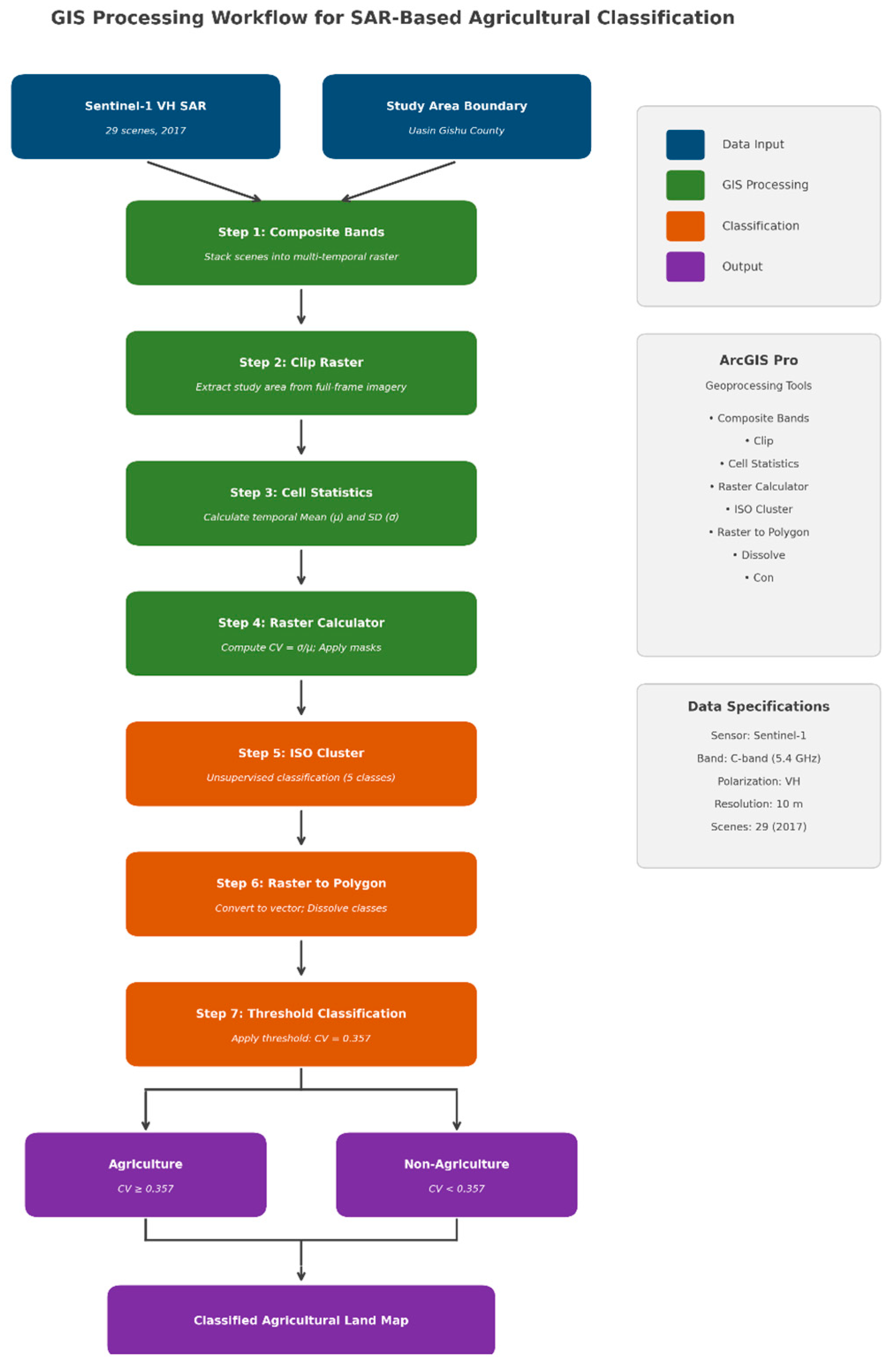 This study presents a comprehensive GIS workflow for agricultural land classification using multi-temporal Sentinel-1 SAR imagery processed with a Coefficient of Variation algorithm, specifically designed for operational contexts where ground-truth data are unavailable. The methodology successfully distinguished active agricultural areas from non-agricultural land in southern Uasin Gishu County, Kenya, achieving an overall accuracy of 87.5% with a Kappa coefficient of 0.73 when validated against Sentinel-2 reference imagery.