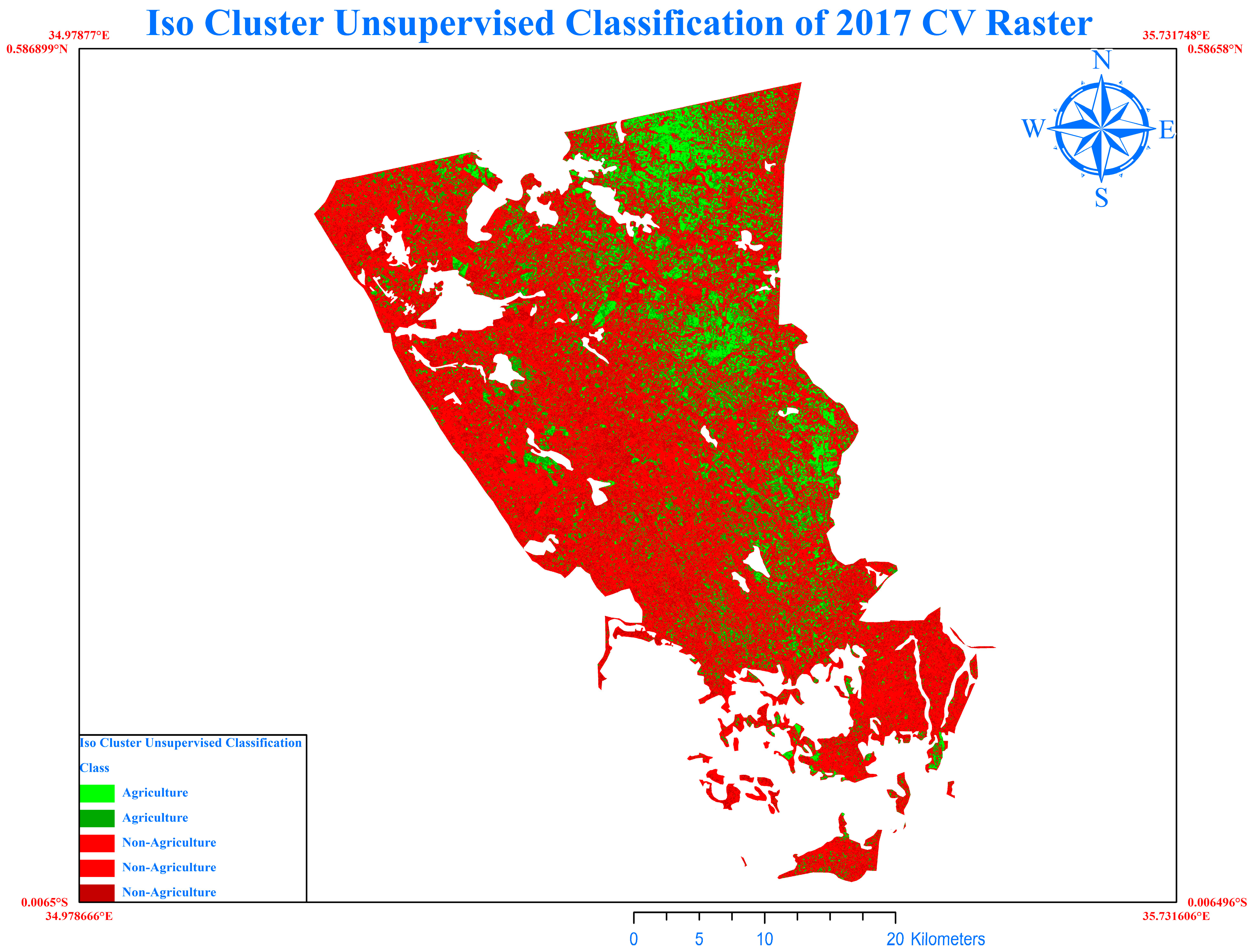 27]. The ISO Cluster algorithm generates cluster centroids through iterative self-organizing data analysis, while the Maximum Likelihood classifier assigns pixels to clusters based on statistical probability. Five classes were identified through iterative testing: three produced insufficient discrimination between agricultural and non-agricultural signatures, while seven or more classes posed interpretability challenges. This combined approach partitioned the CV raster without requiring training data. The ISO Cluster step served an exploratory role, confirming that the CV data contained separable class structure and that existing unsupervised algorithms could meaningfully distinguish agricultural from non-agricultural signatures. However, subsequent cluster interpretation required manually assigning ISO classes to land-cover categories based on visual comparison with Sentinel-2 imagery (