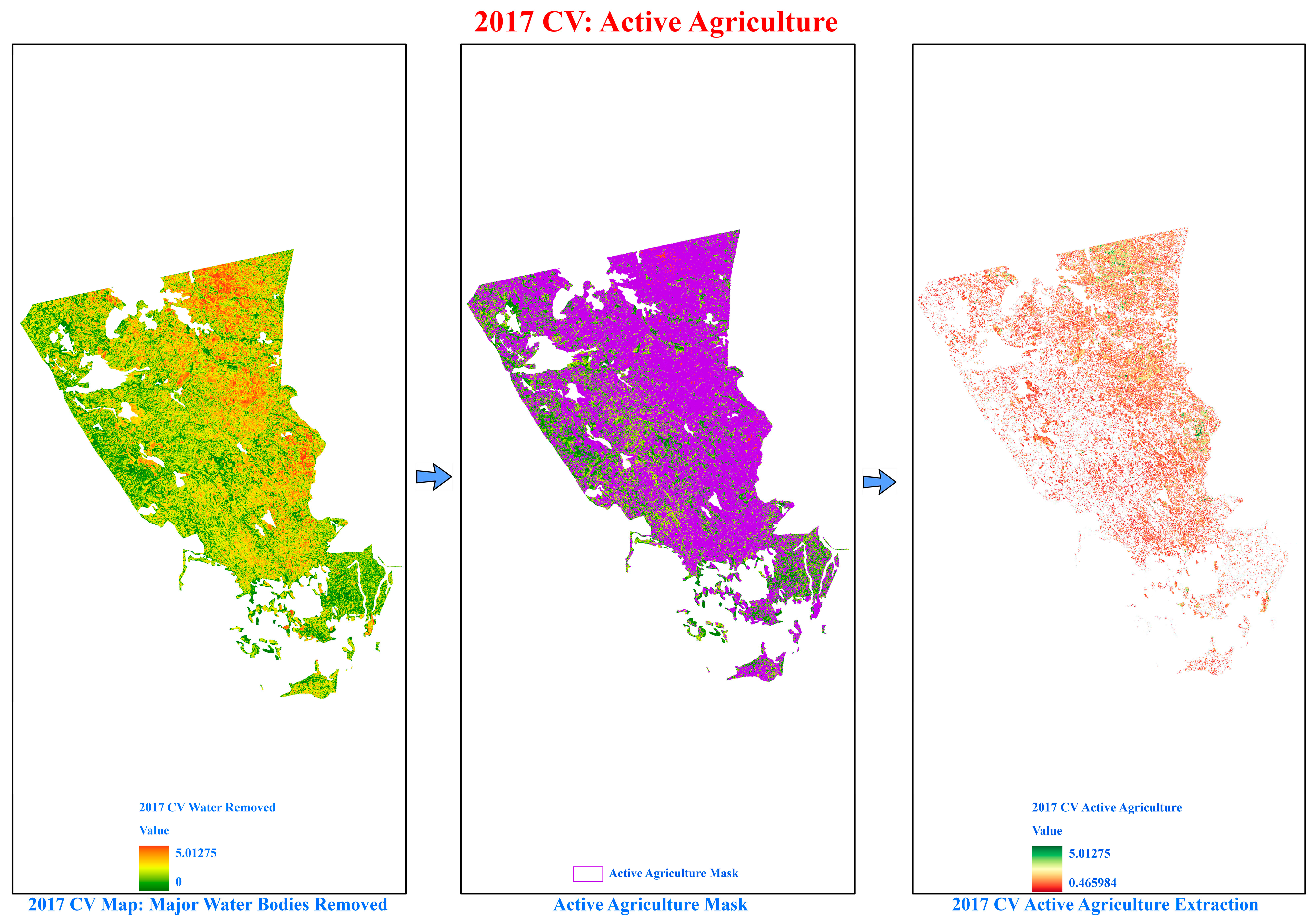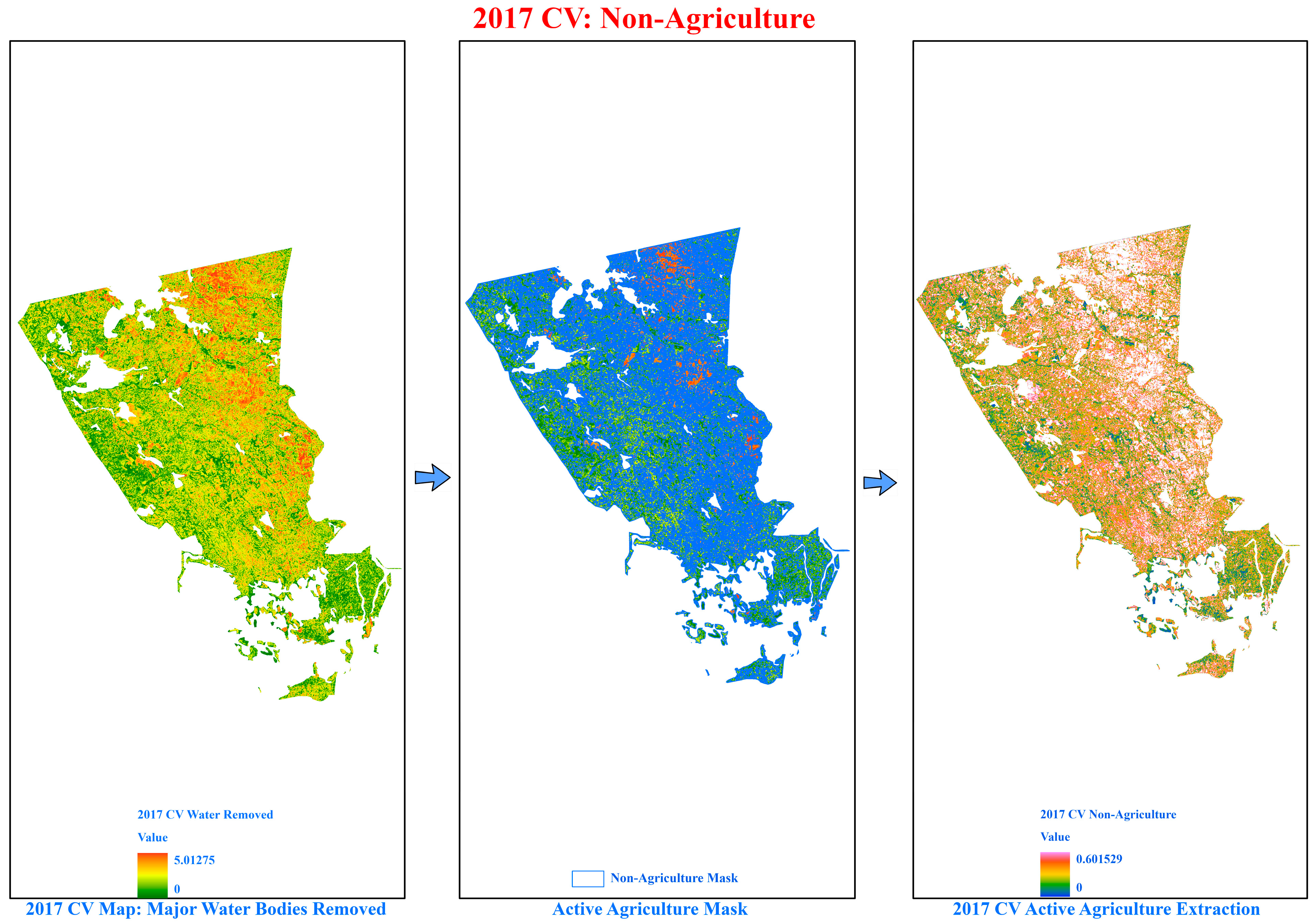 Step 5: Feature Masking: Using ancillary data layers, major water bodies, urban areas, and buffer zones around these features were masked from the CV raster to reduce classification errors caused by non-agricultural sources of temporal variability.