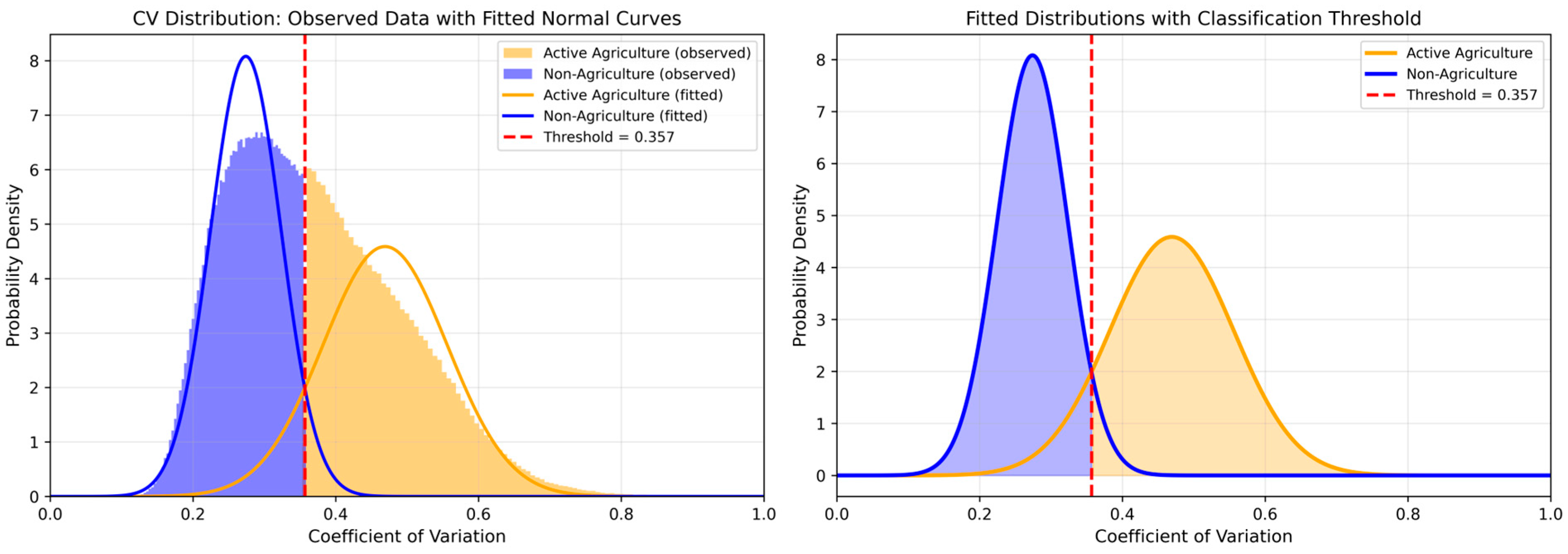 The optimal classification threshold was determined analytically by computing the intersection point of the two fitted normal distributions using Brent’s root-finding method. This intersection, at CV = 0.357, corresponds to the value at which the misclassification probability is equal for both classes. At this threshold, 90.2% of active agriculture pixels and 95.3% of non-agriculture pixels fall on the correct side of the decision boundary based on the fitted distributions (