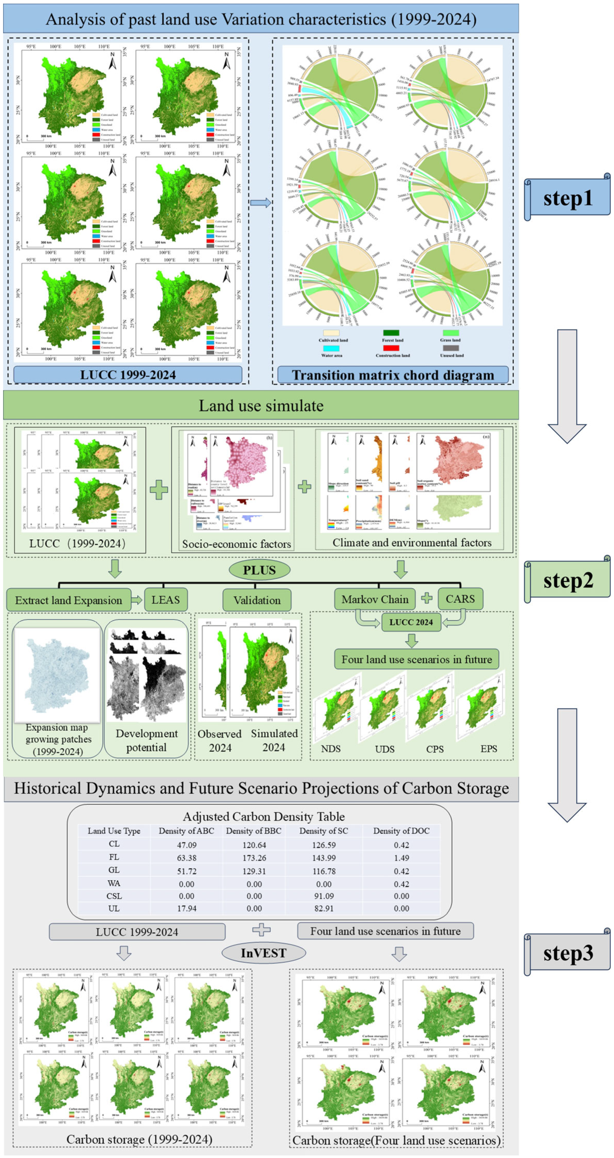 - Zhang, J.; Cao, P.; Roosli, R. Assessing land use and carbon storage changes using PLUS and InVEST models: A multi-scenario simulation in Hohhot. Environ. Sustain. Indic. 2025, 26, 100655. [Google Scholar] [CrossRef]