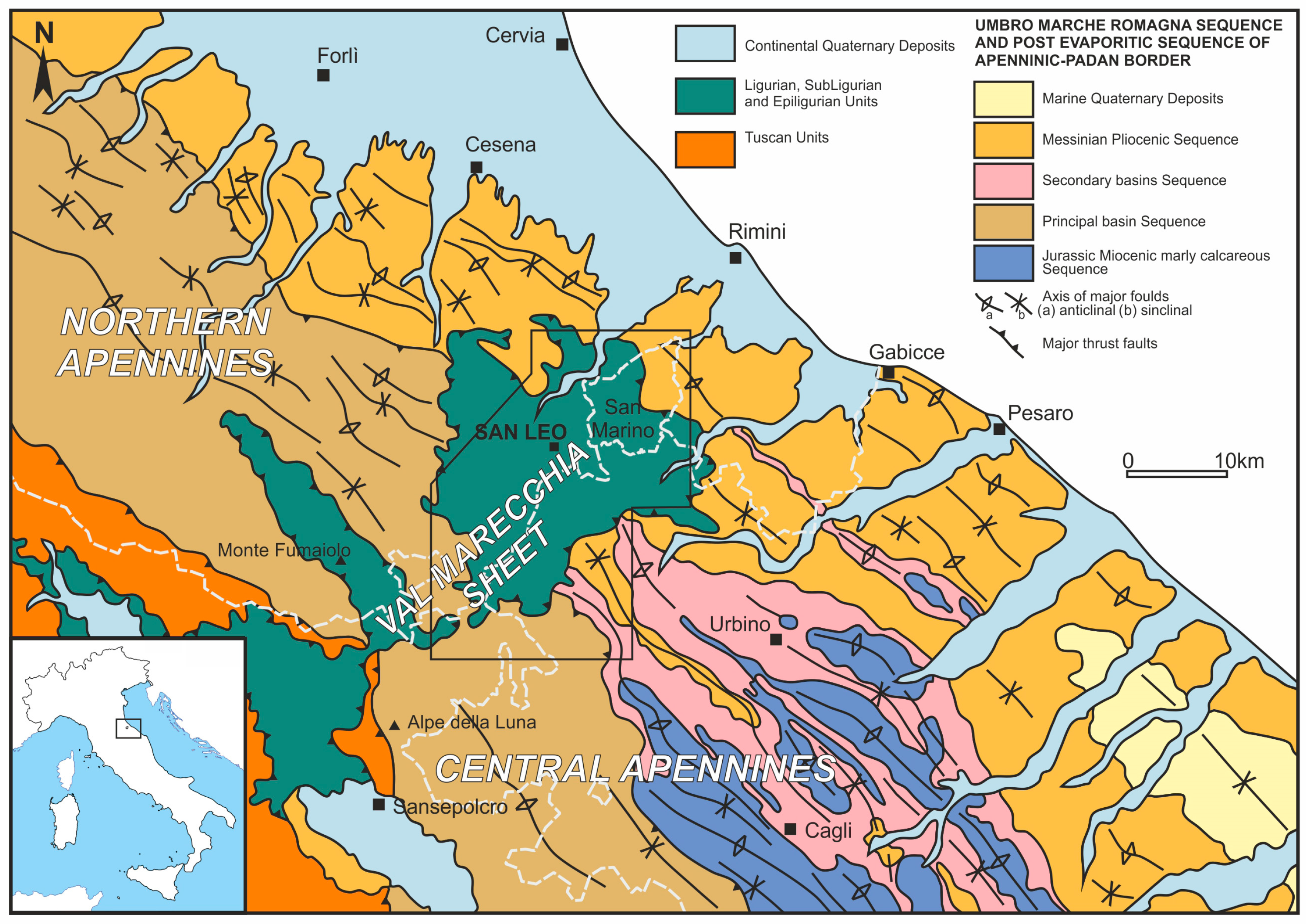 - Cornamusini, G.; Conti, P.; Bonciani, F.; Callegari, I.; Martelli, L. Geology of the ‘Coltre della Val Marecchia’ (Romagna-Marche Northern Apennines, Italy). J. Maps 2017, 13, 207–218. [Google Scholar] [CrossRef]