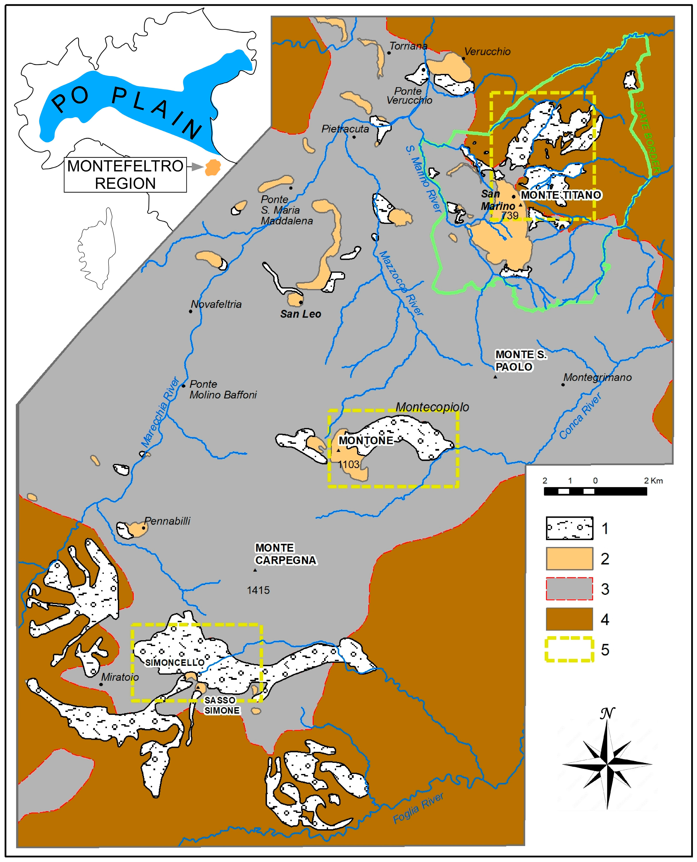 - Nesci, O.; Savelli, D.; Diligenti, A.; Marinangeli, D. Geomorphological sites in the northern Marche (Italy). Examples from autochthon anticline ridges and from Val Marecchia allochthon. Il Quat. Ital. J. Quat. Sci. 2005, 18, 77–89. [Google Scholar]