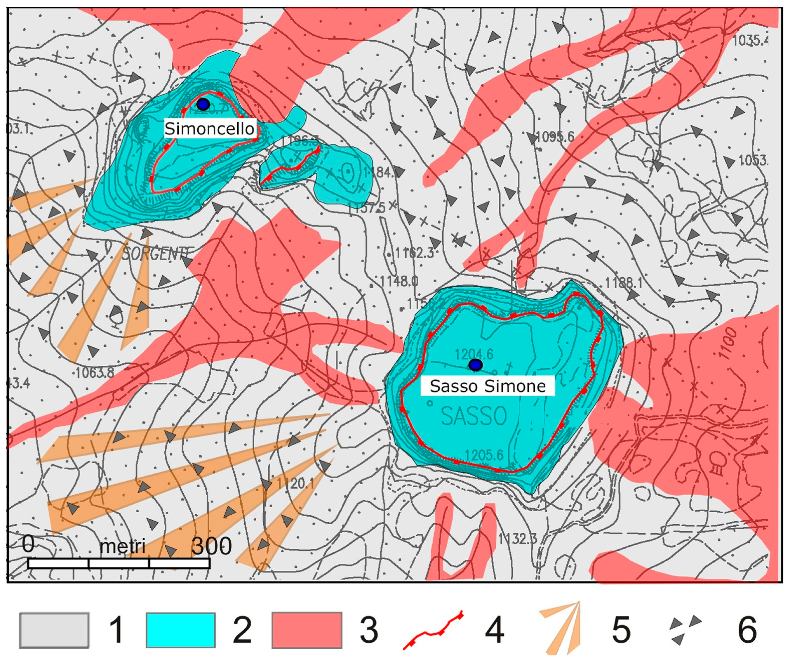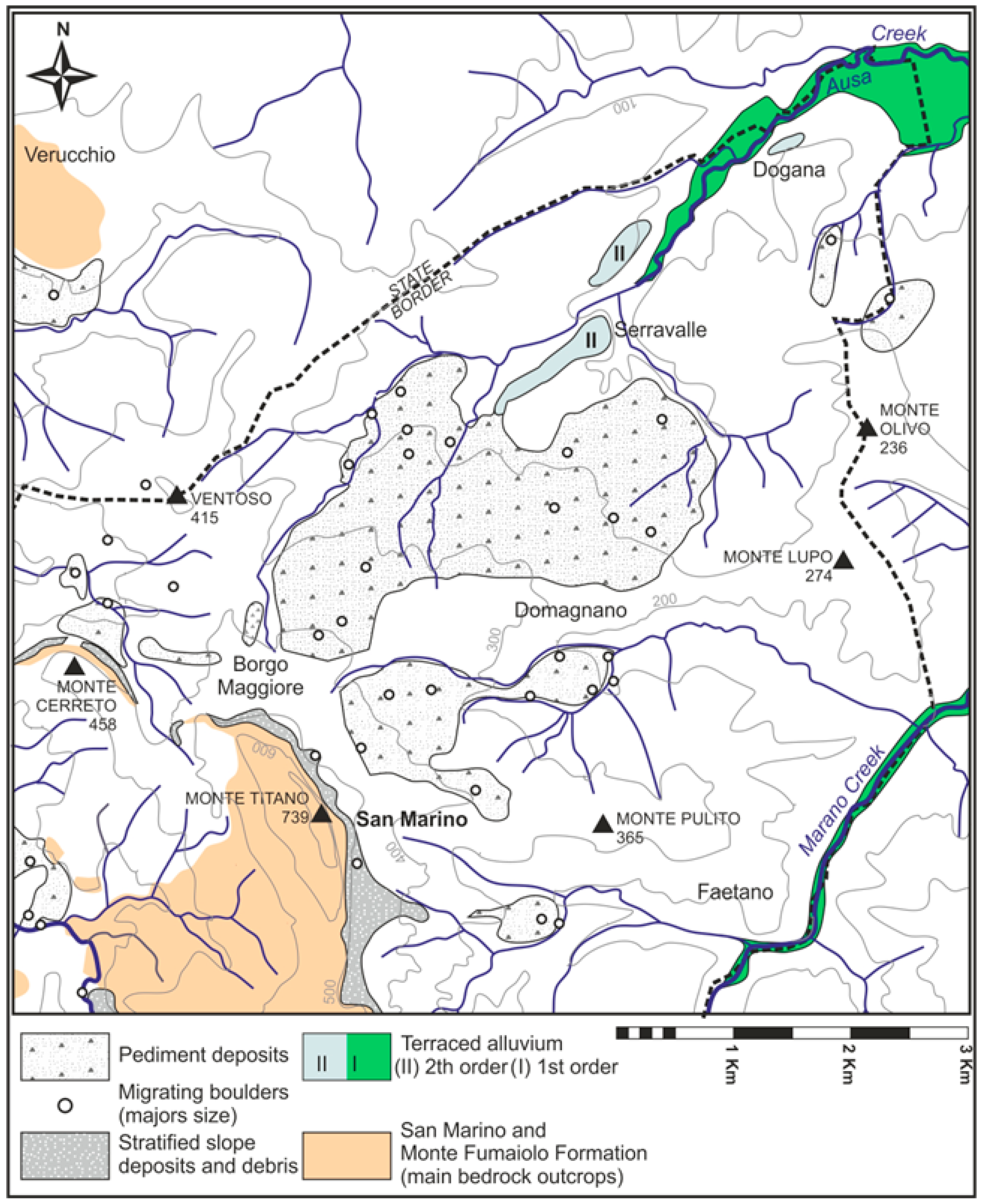 - Quantitative Estimation: Morphometric analysis of the San Marino area estimates the volume of calcareous debris within the pediments at approximately 107 m3. This correlates to a minimum cliff retreat of 50 m for the Monte Titano front, providing a magnitude for these erosive processes over time.