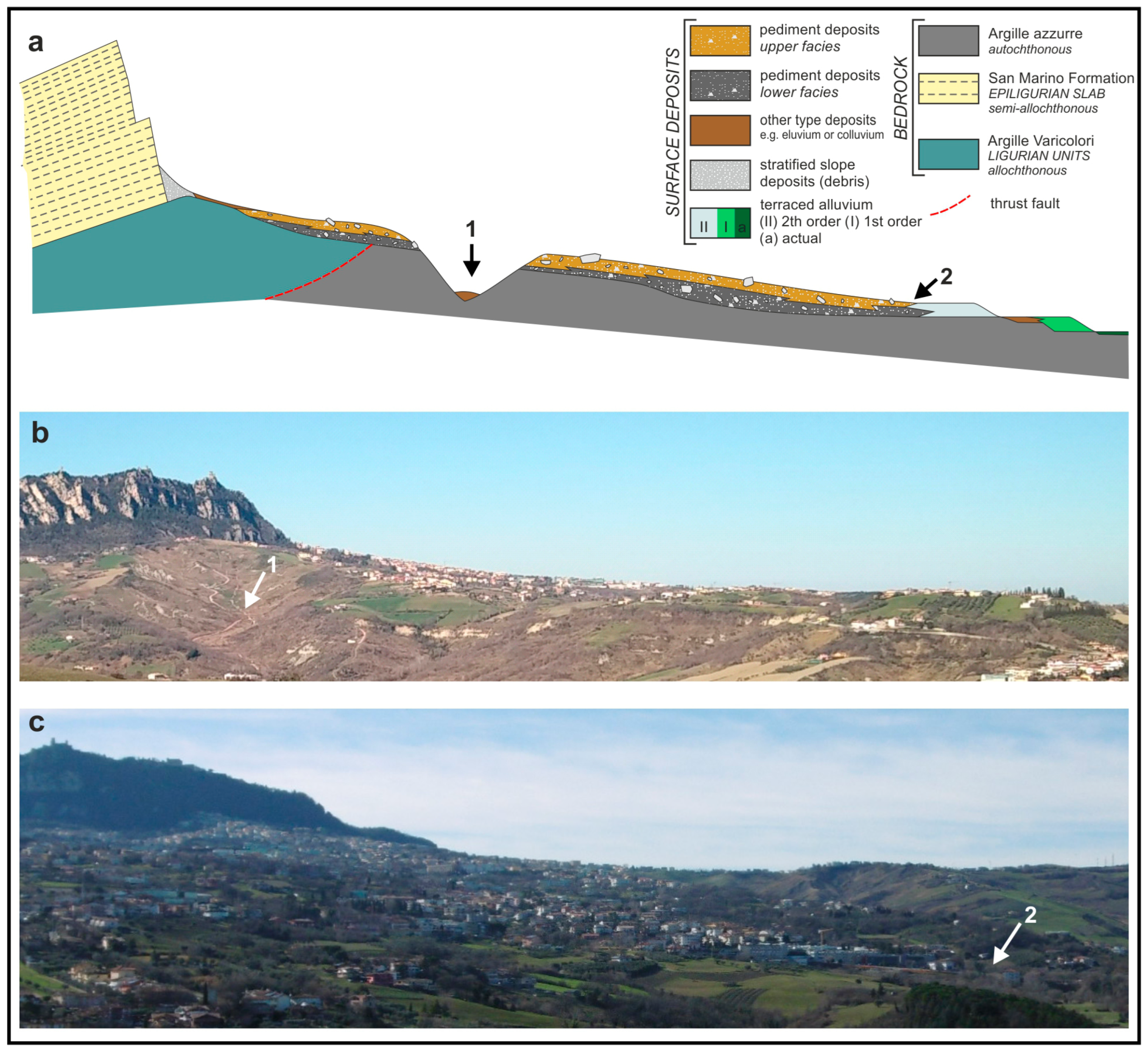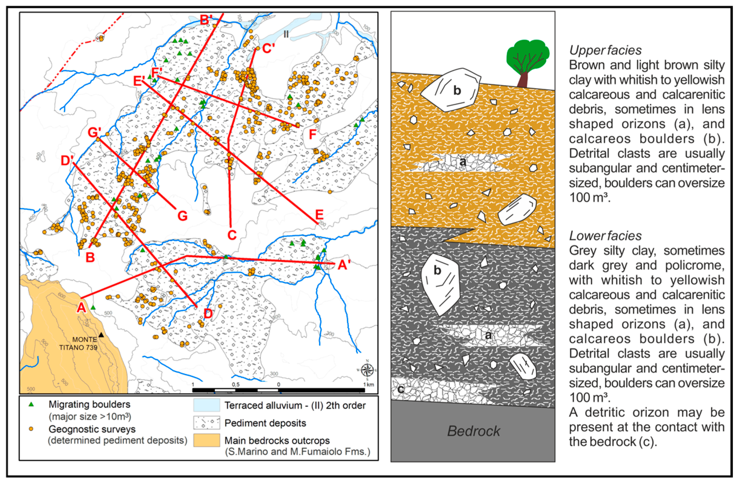 - Late glacial Evolutionary Context: The genesis of the pediment deposits in the Valmarecchia-Montefeltro area is linked to late glacial climatic conditions. The combination of intense freeze–thaw cycles fracturing the rock mass, followed by rapid snowmelt saturating the underlying clays, triggered extensive soil creep and mudflows.