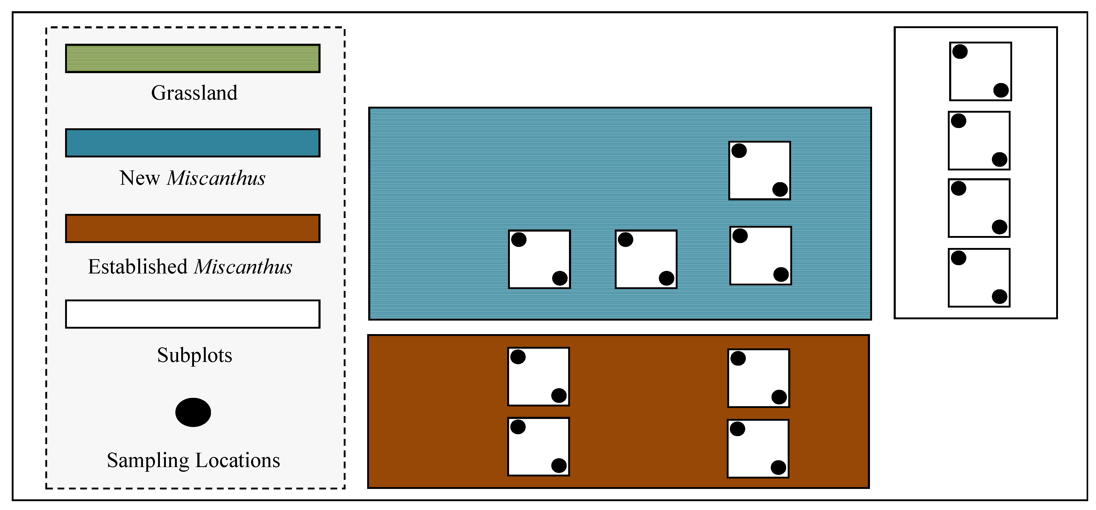 - Dondini, M.; van Groenigen, K.-J.; del Galdo, I.; Jones, M.B. Carbon sequestration under Miscanthus: A study of 13C distribution in soil aggregates. GCB Bioenergy 2009, 1, 321–330. [Google Scholar] [CrossRef]