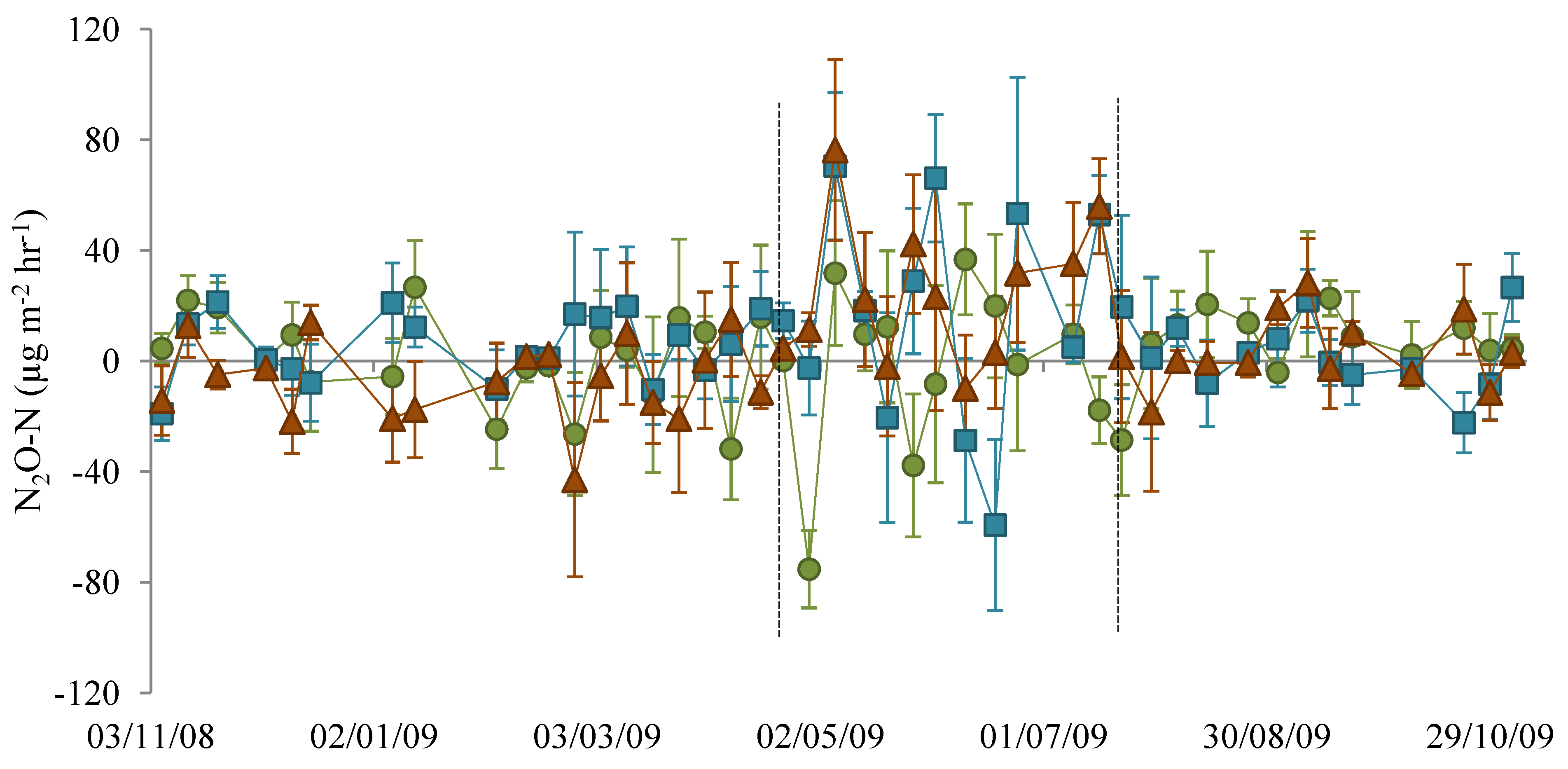 Figure 2 shows mean N2O flux (±SE, n = 8) from all land uses from November 2008 to November 2009. Mean fluxes showed large variation within treatment, with G ranging from −75 to 37 µg·N·m−2·hr−1, NM ranging from −59 to 70 µg·N·m−2·hr−1 and EM ranging from −43 to 76 µg·N·m−2·hr−1. The majority of the positive and negative peaks occurred between the dates 22 April 2009 and 22 July 2009. Analysing these data by repeated measures two-way ANOVA showed that time (p = 0.0109, df = 43) and interaction (p = 0.0129, df = 86) had a significant effect on N2O flux, but land use did not (p = 0.5293, df = 2). It should also be noted that N2O consumption was frequent, with uptake observed in 36%, 40% and 42% of all measurements in NM, EM and G respectively.