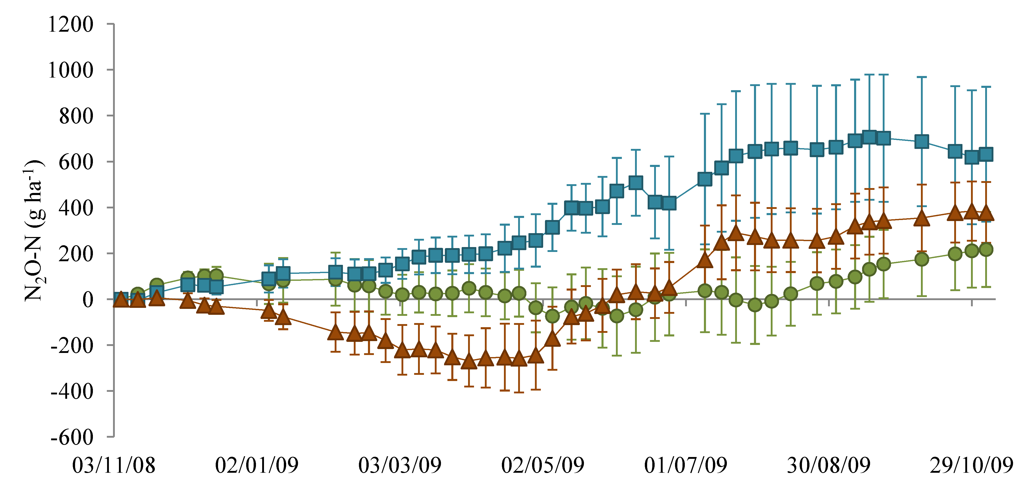 Cumulative N2O Flux (g·N·ha−1) ± SE (n = 8) over one year from three land uses; G (